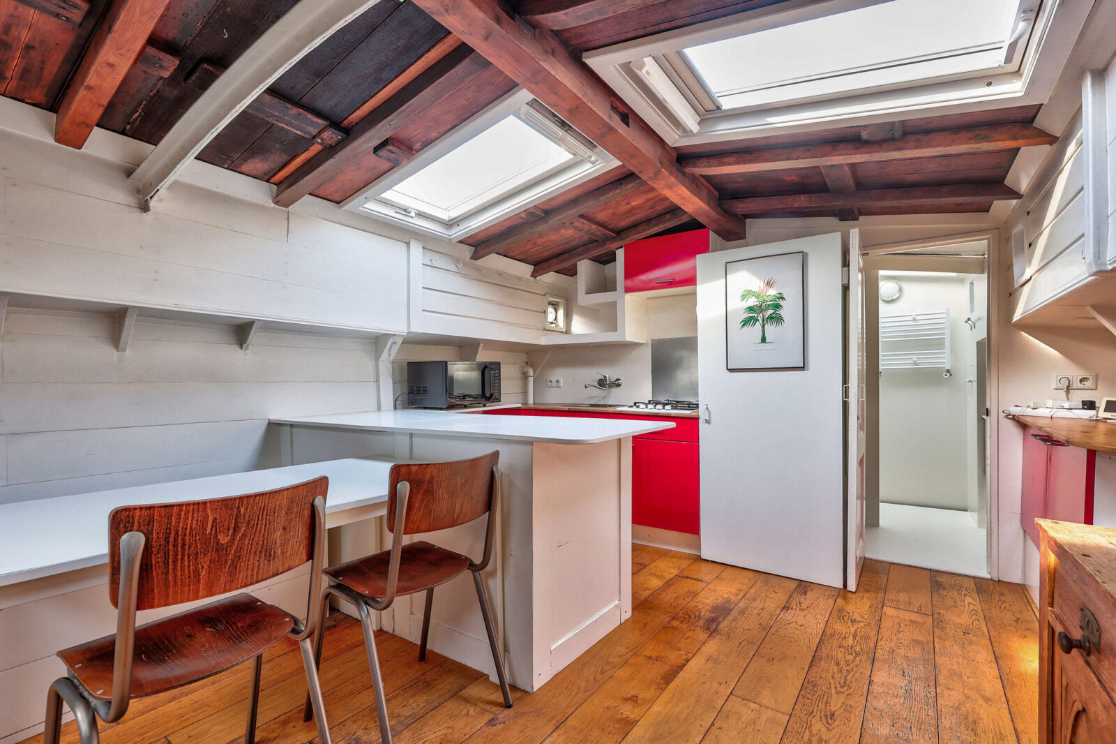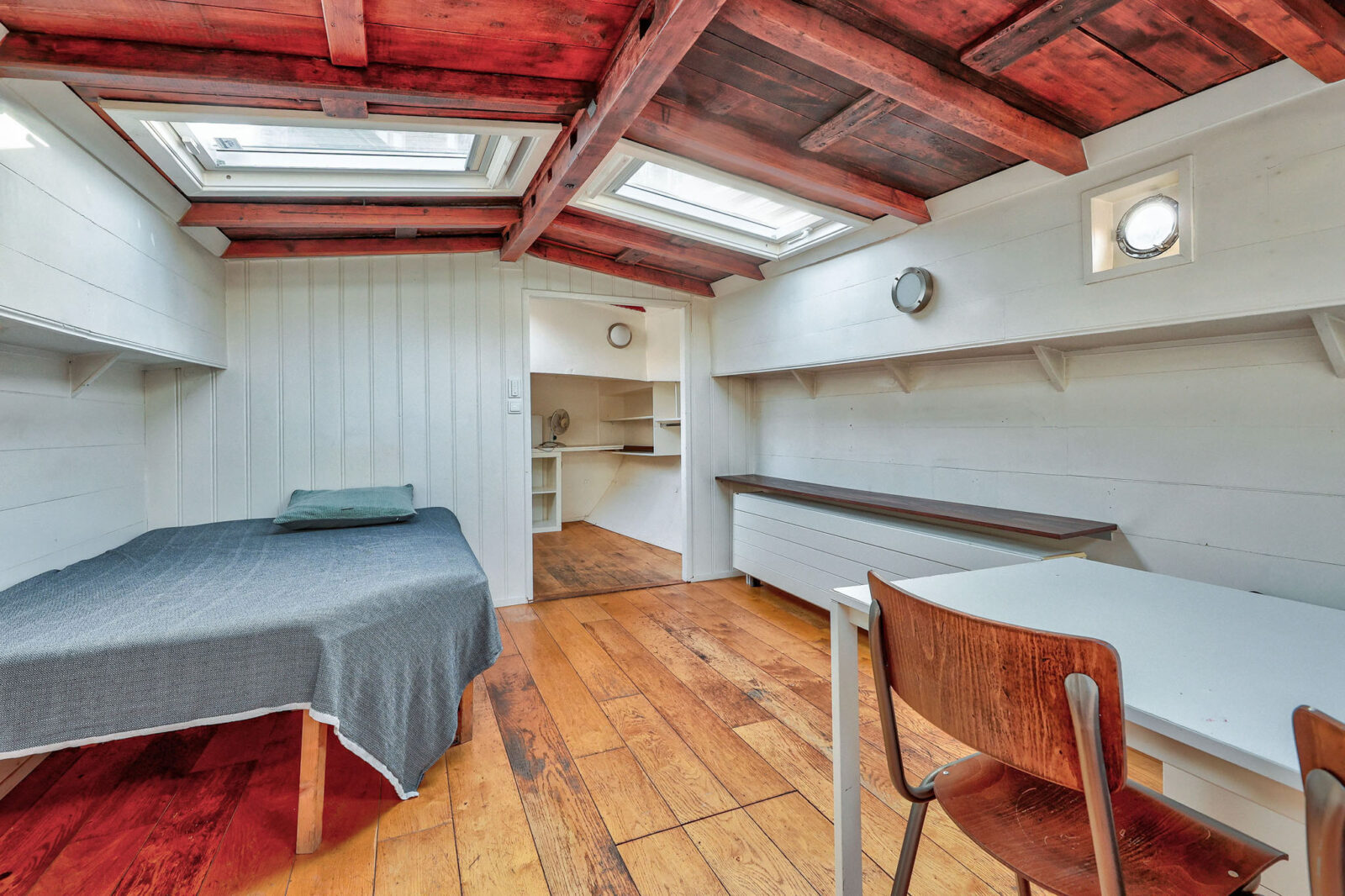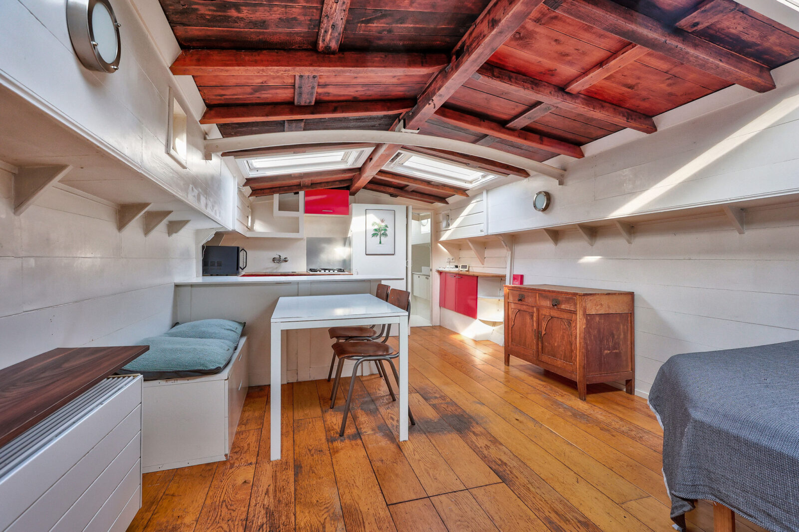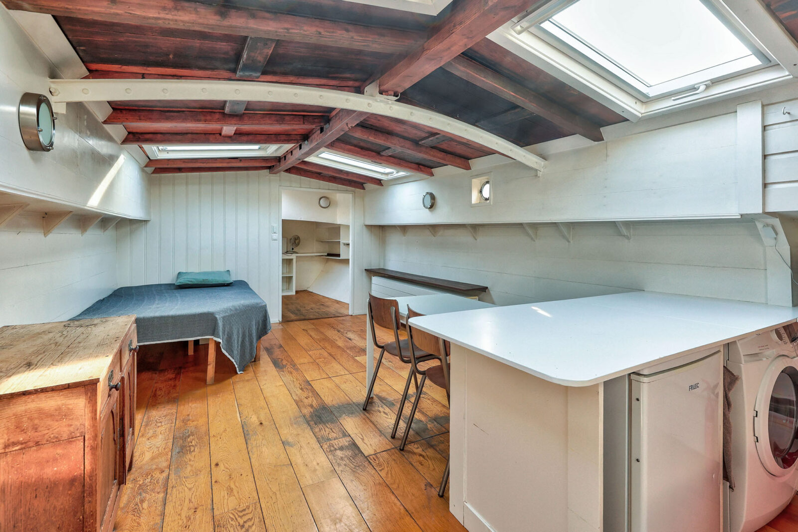 Je betreedt het hoofdverblijf en komt binnen in de woonkamer met open keuken – het hart van het schip. Dankzij maar liefst zes Velux dakramen valt het daglicht rijkelijk naar binnen en ontstaat een prettige, open sfeer binnen de circa 44 m² woonruimte.
