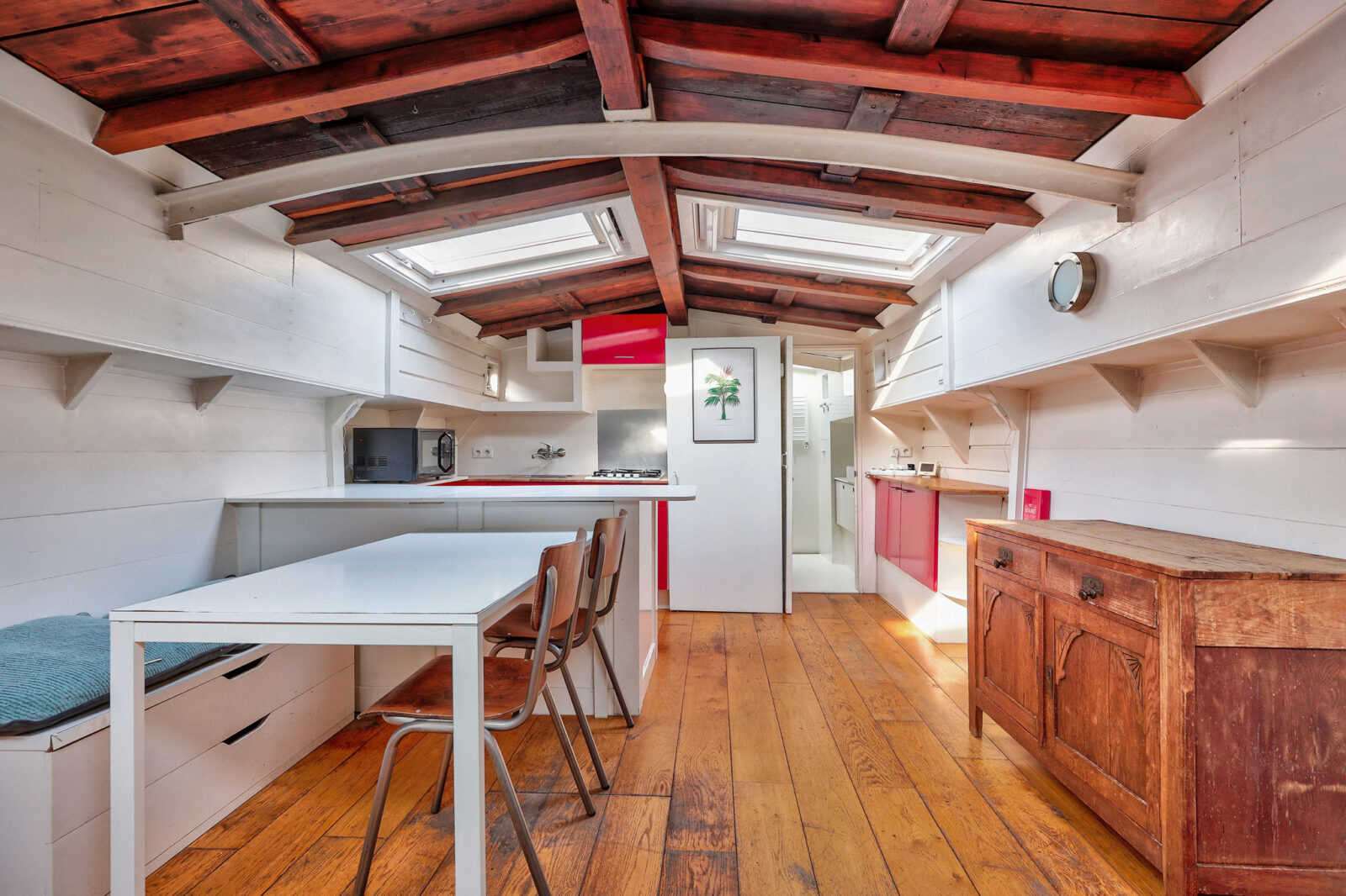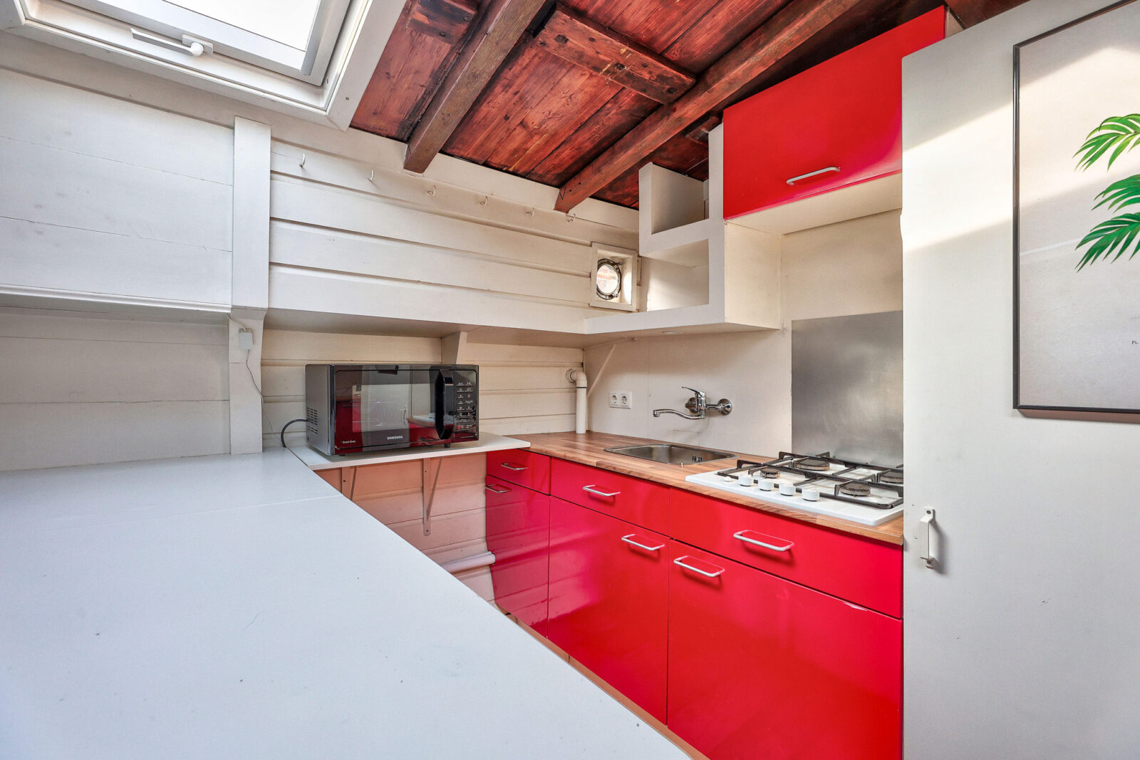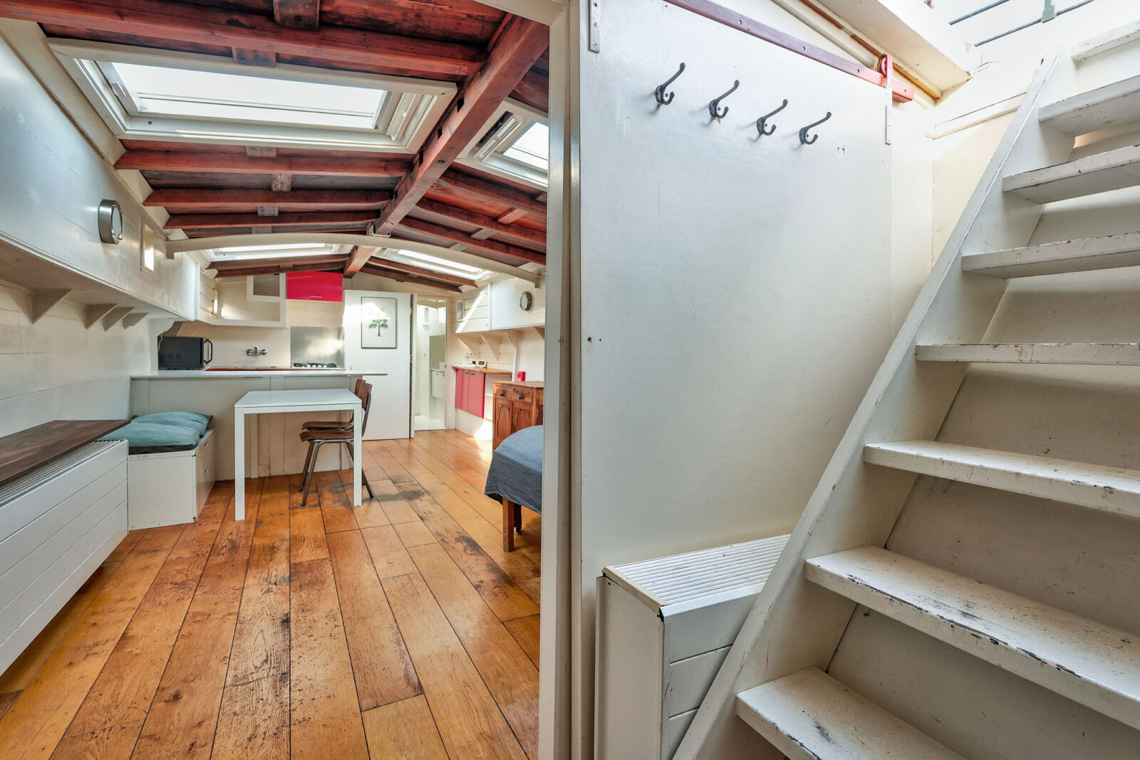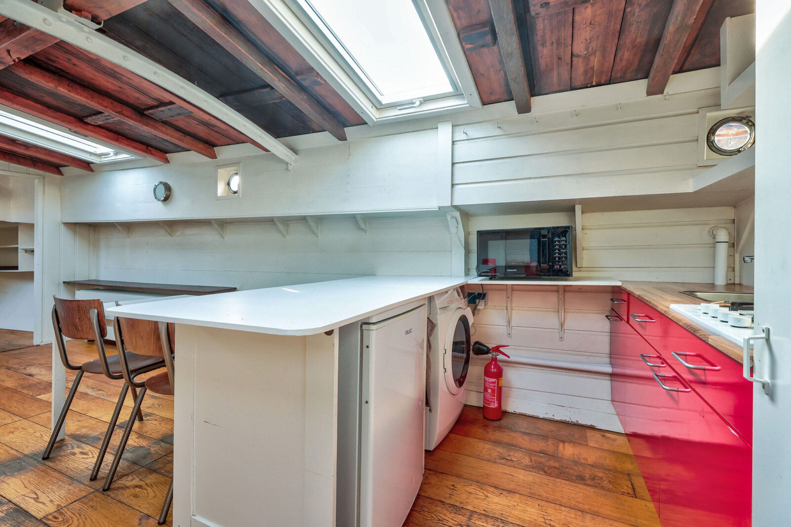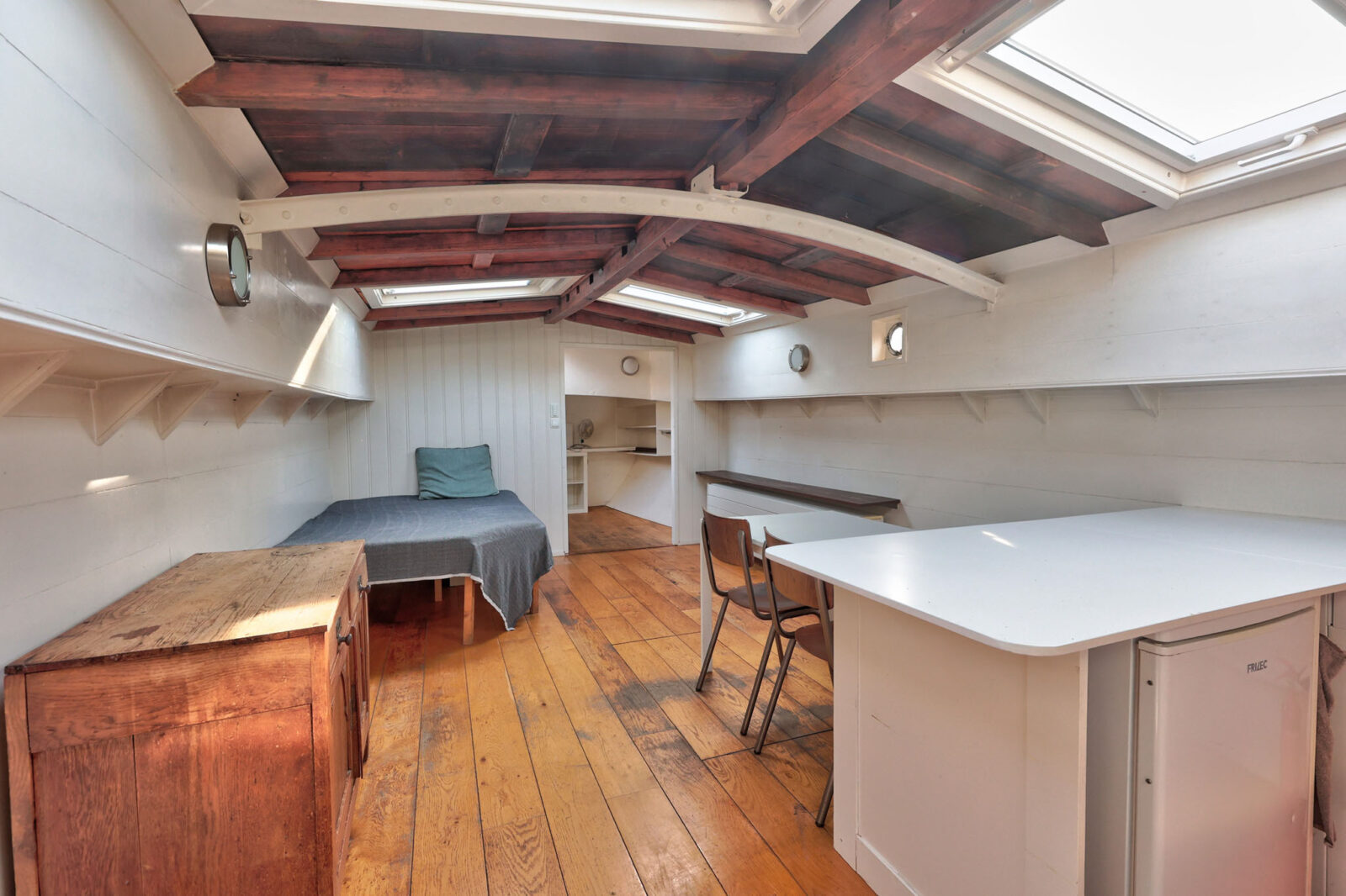 Je betreedt het hoofdverblijf en komt binnen in de woonkamer met open keuken – het hart van het schip. Dankzij maar liefst zes Velux dakramen valt het daglicht rijkelijk naar binnen en ontstaat een prettige, open sfeer binnen de circa 44 m² woonruimte.