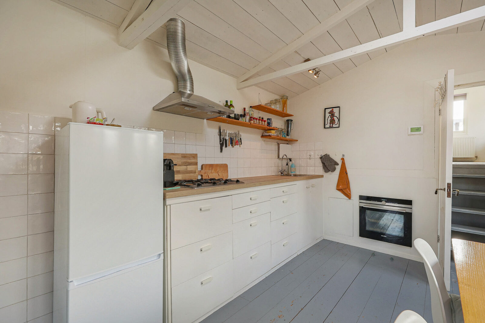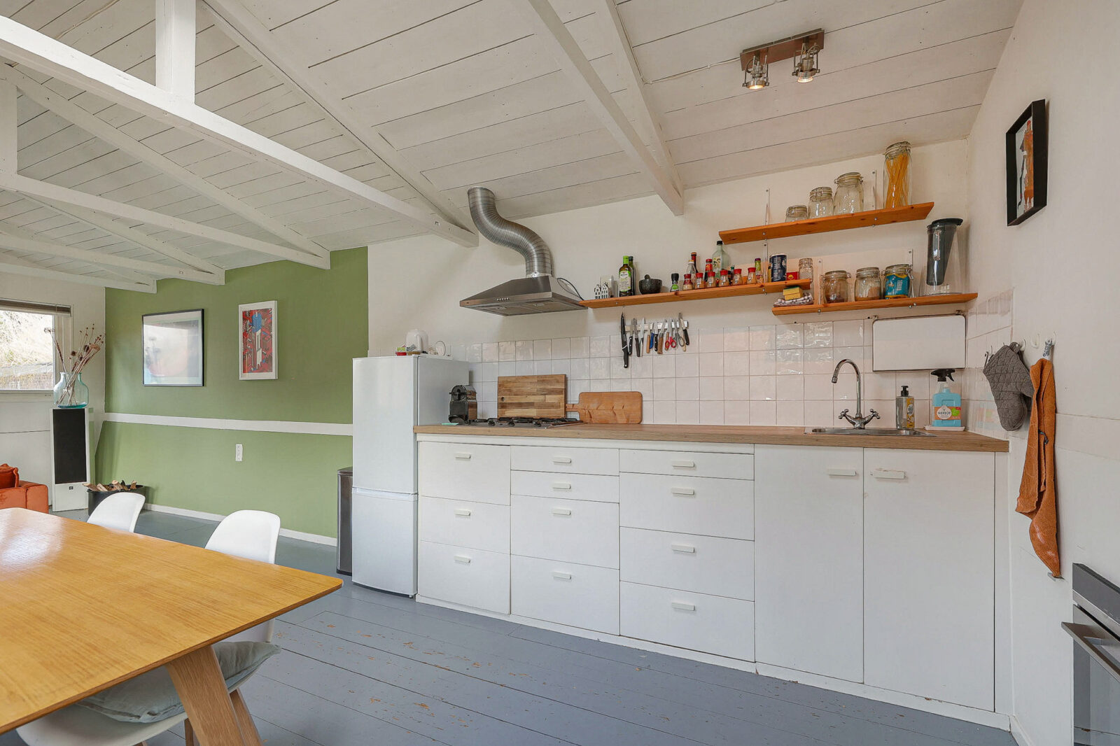 De open keuken sluit naadloos aan en is voorzien van een oven, gasfornuis en