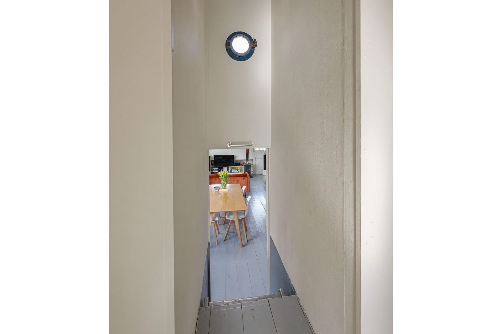 De entree brengt je in de hal, waar direct de verbinding met het water voelbaar is dankzij