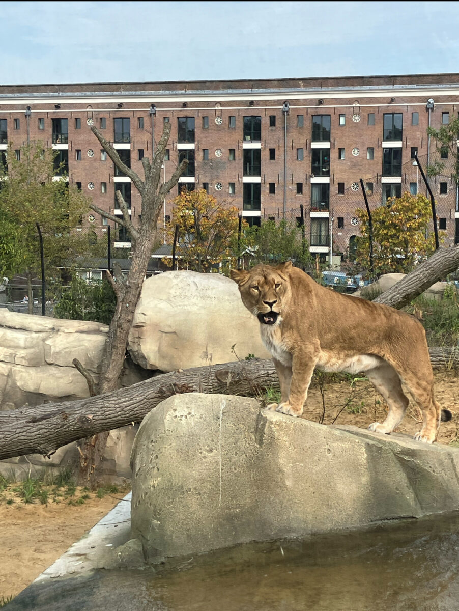 Pal tegenover het nieuwe leeuwenverblijf van Artis, met de stad aan je voeten en het