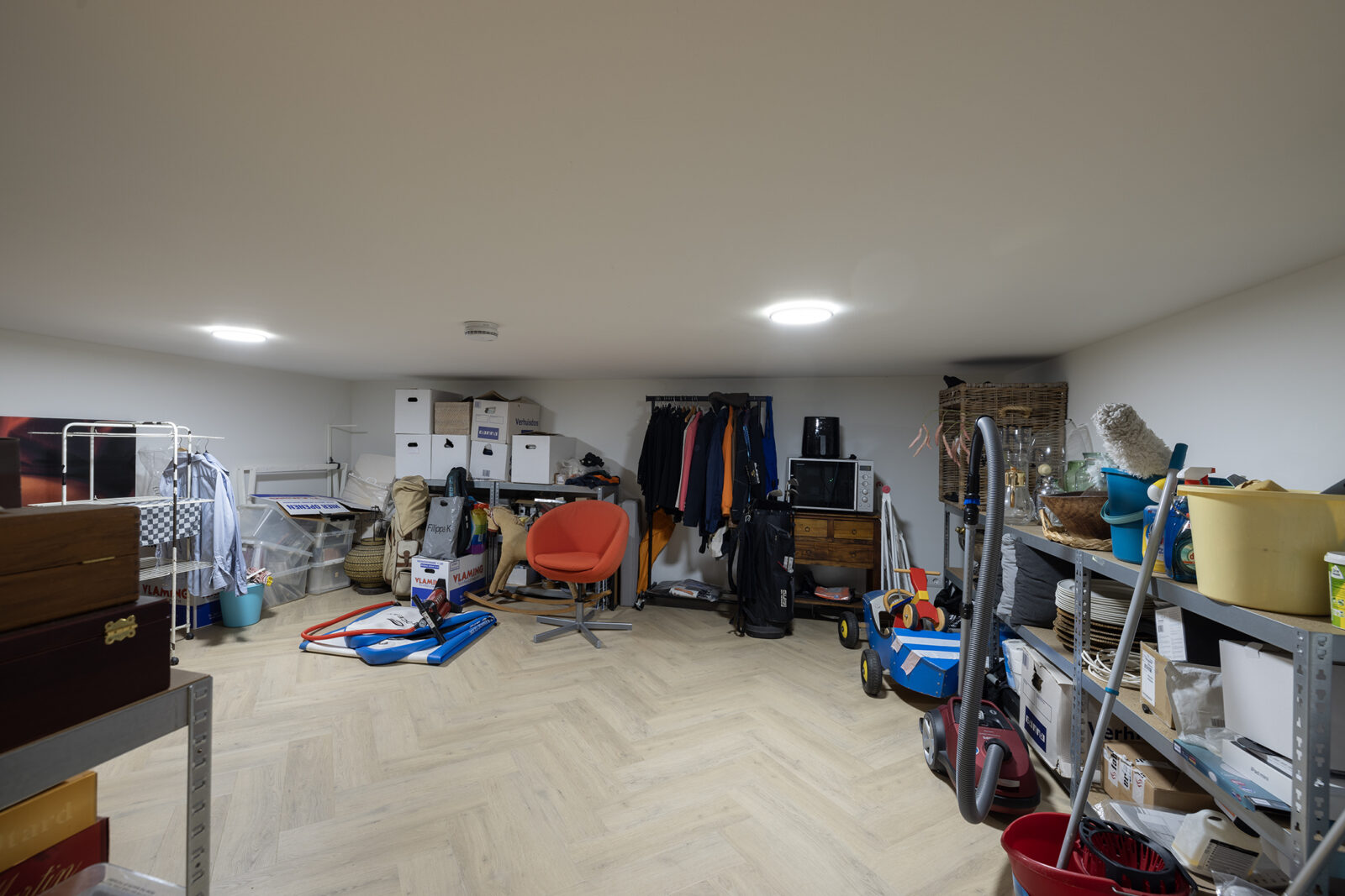 De eiken trap naar de etage sous l’eau komt uit op een ruime hal met toilet en de opstellingsruimte voor wasmachine, droger en wijnklimaatkast. Aan de hal liggen twee ruime slaapkamers met vaste kasten, een grote berging (hoogte 1,8 meter), een 3e slaapkamer/fitnessruimte met airconditioning en de tweede badkamer met wastafelmeubel en zeer ruime inloopdouche/hammam (turks stoombad).