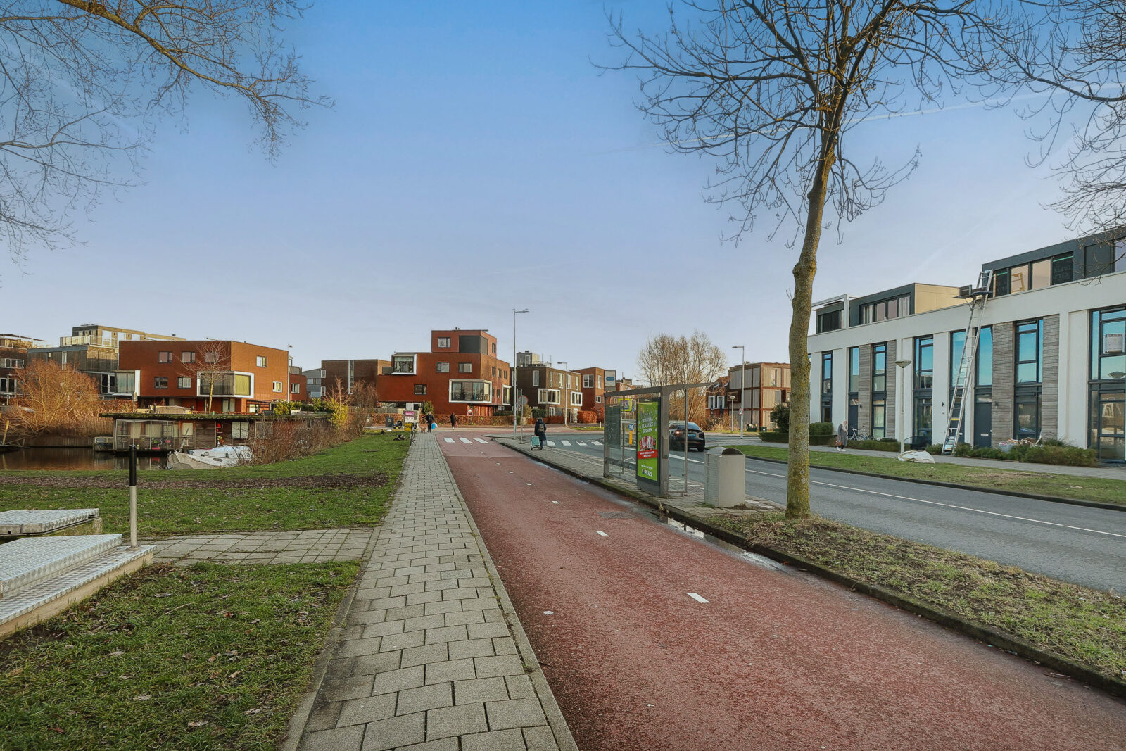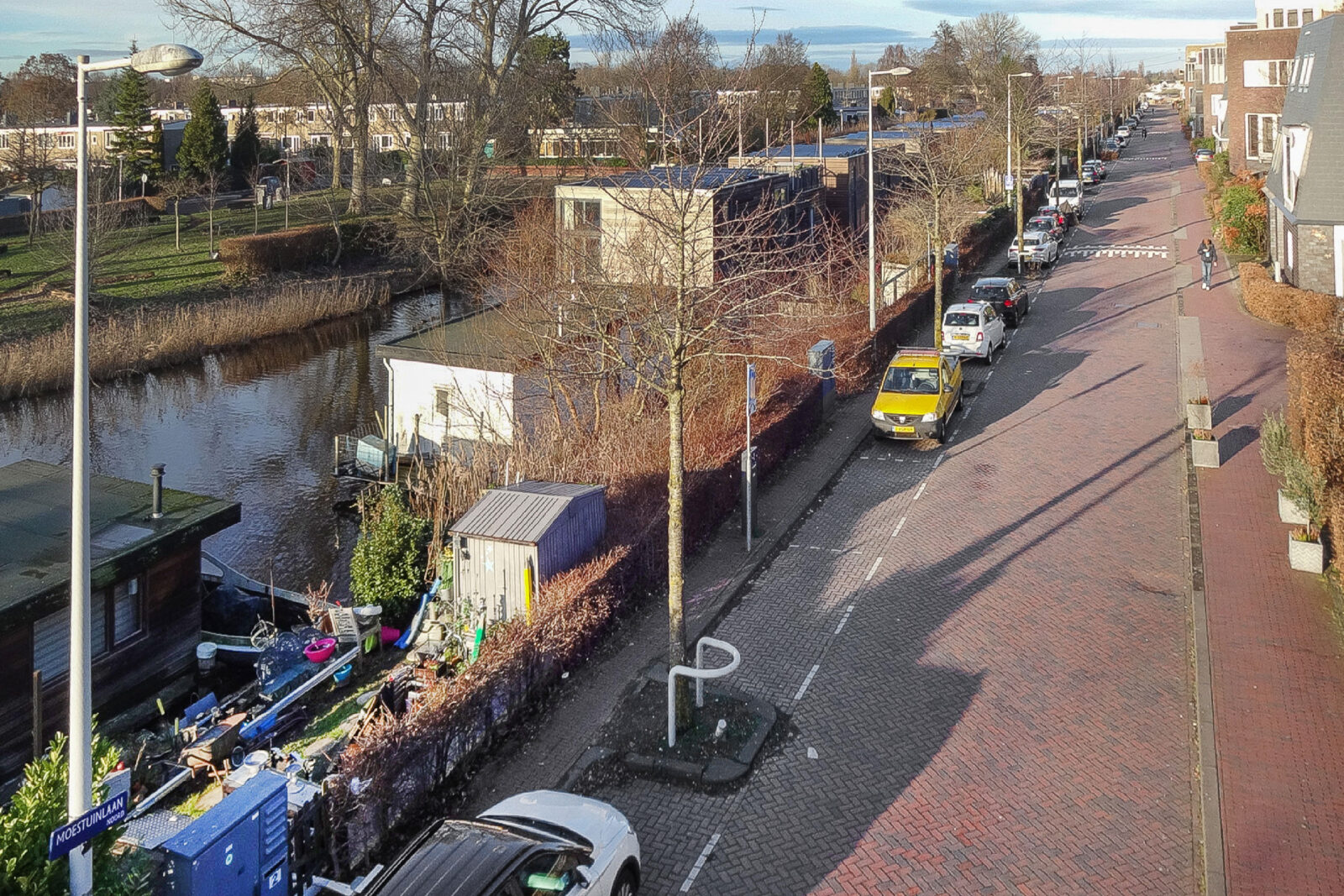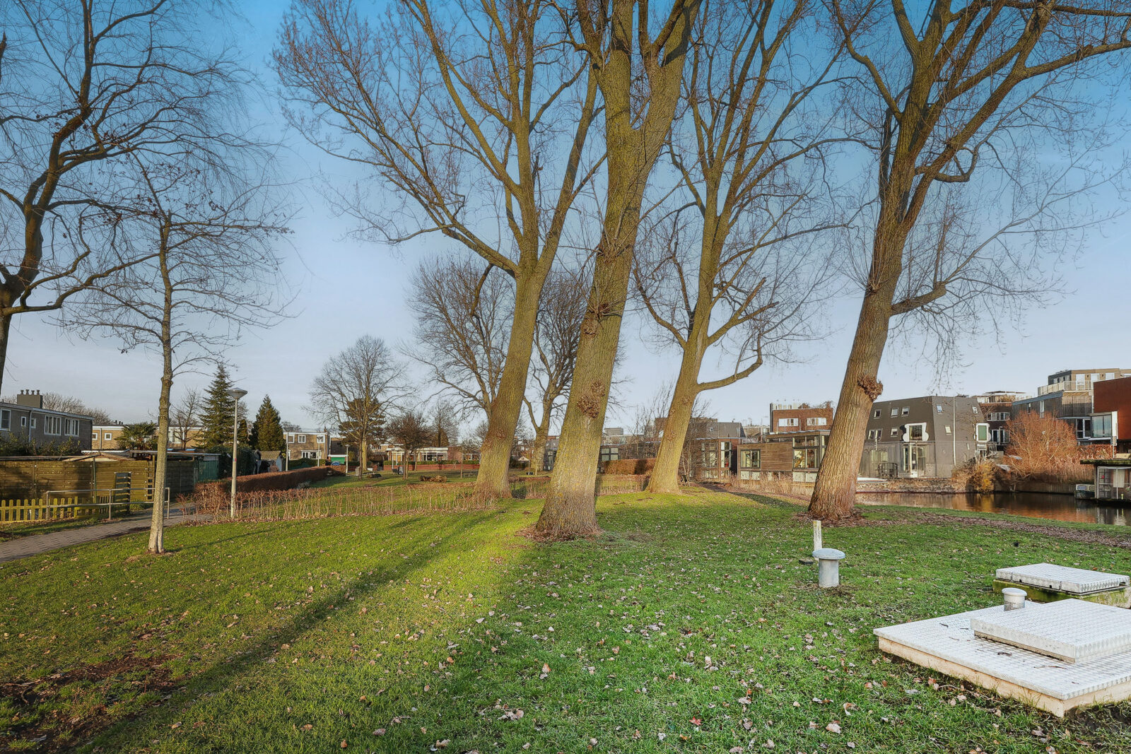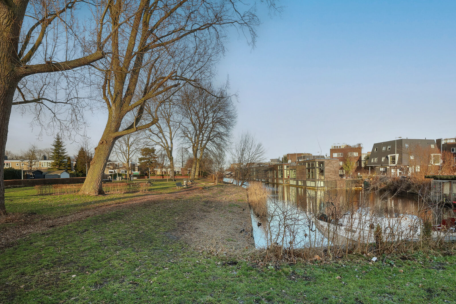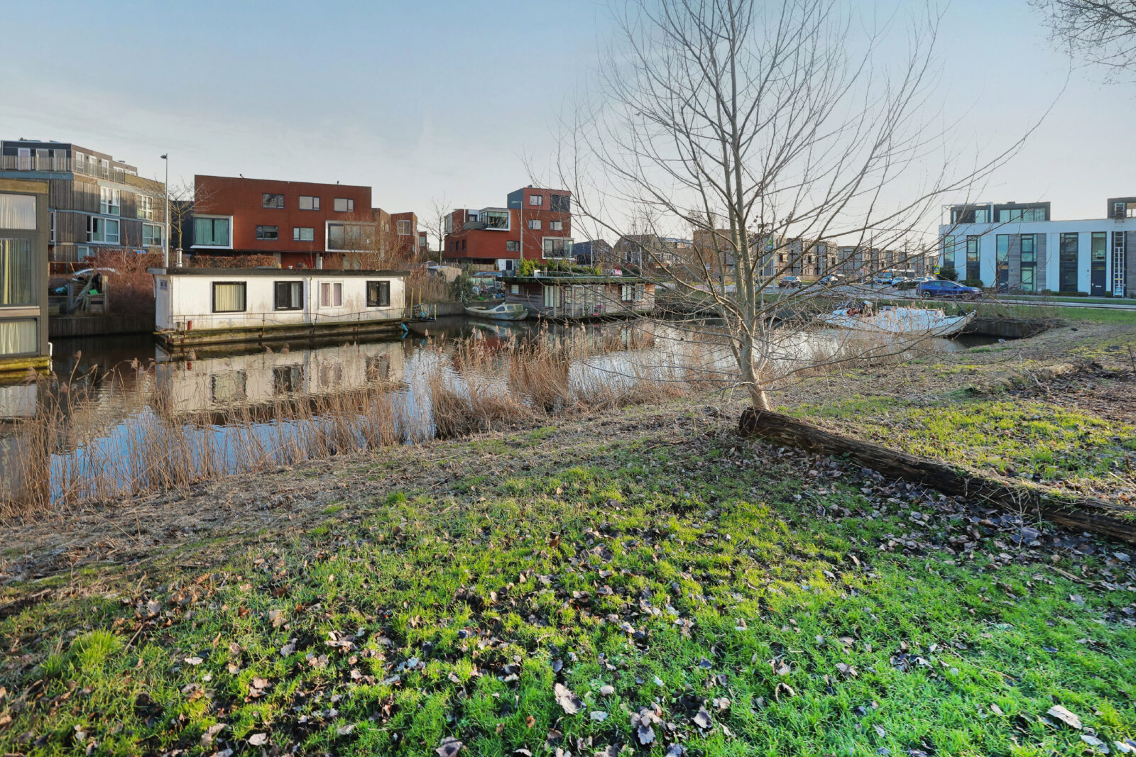 Direct tegenover de ligplaats ligt openbaar groen met volwassen bomen en wandelpaden. Dat zorgt voor vrij uitzicht, extra privacy en een prettige afstand tot overburen. De open ligging garandeert bovendien een goede lichtinval gedurende de dag — een belangrijke kwaliteit voor wie ruim en transparant wil bouwen.