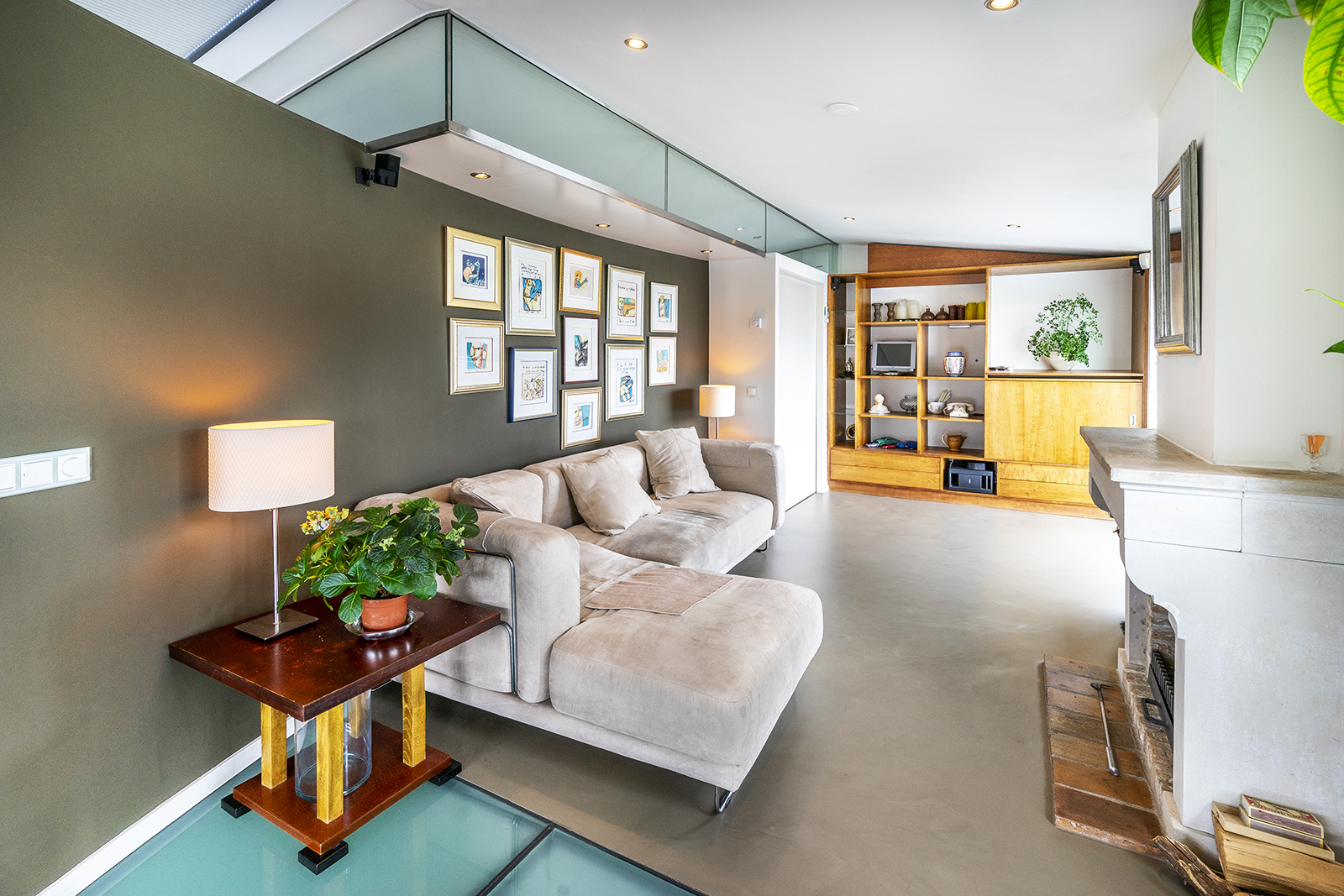 De open keuken met royaal eetgedeelte grenst aan het aangebouwde terras aan de kopse kant. Enorme schuifdeuren voorzien van glas zorgen voor een riant uitzicht over het water en de weilanden. De strak vormgegeven keuken met kookeiland is uitgevoerd in rvs en antraciet en is voorzien van de modernste snufjes. De moderne gietvloer wordt onderbroken door een glazen doorkijkje en loopt verder naar een intieme woonkamer, die eenvoudig onttrokken kan worden aan het zicht van watersporters. In de killere maanden is hier een hoofdrol weggelegd voor de openhaard.
