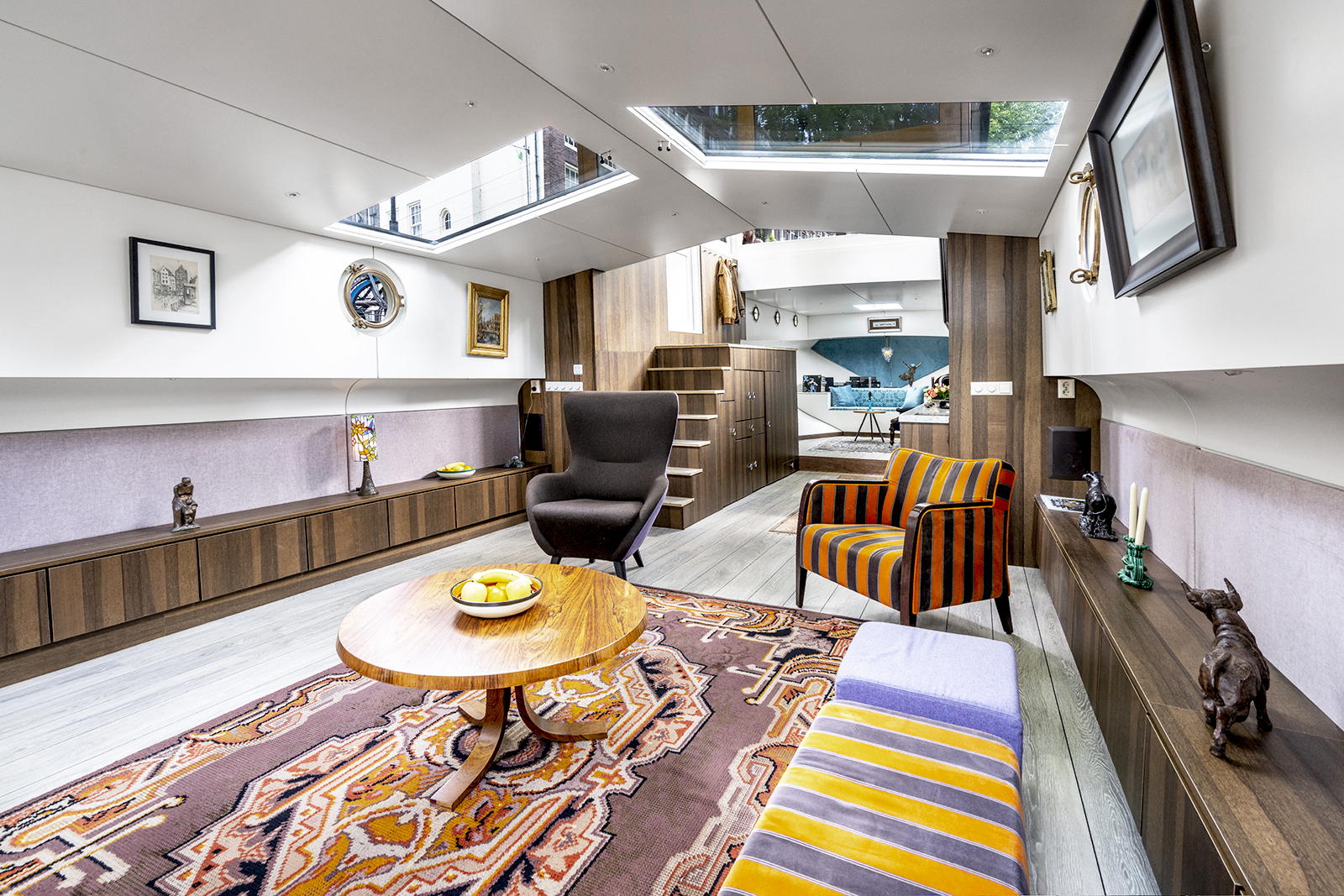 Het eerste wat opvalt is hoe ingenieus de beschikbare ruimte in het schip wordt benut. Zo heeft het stuurhuis een vrije hoogte van maar liefst 4 meter, compleet met kroonluchter in top. Het resulteert in extra ruimtelijkheid en prachtige lichtinval. In de oorspronkelijke luikenkap zijn fraaie daklichten aangebracht, waardoor de woonkamer en open keuken baden in natuurlijk licht.