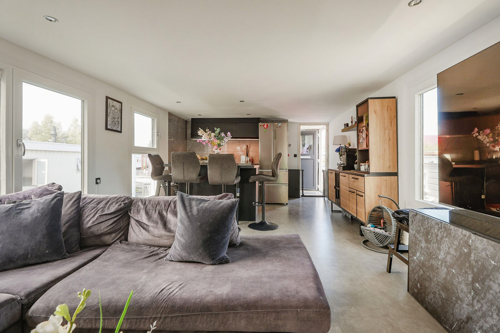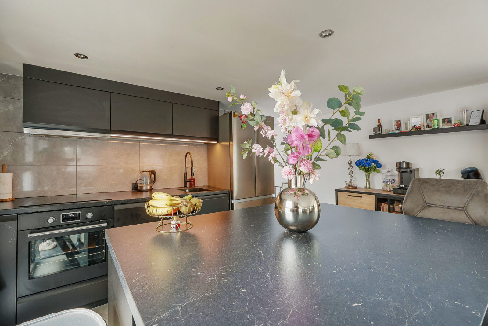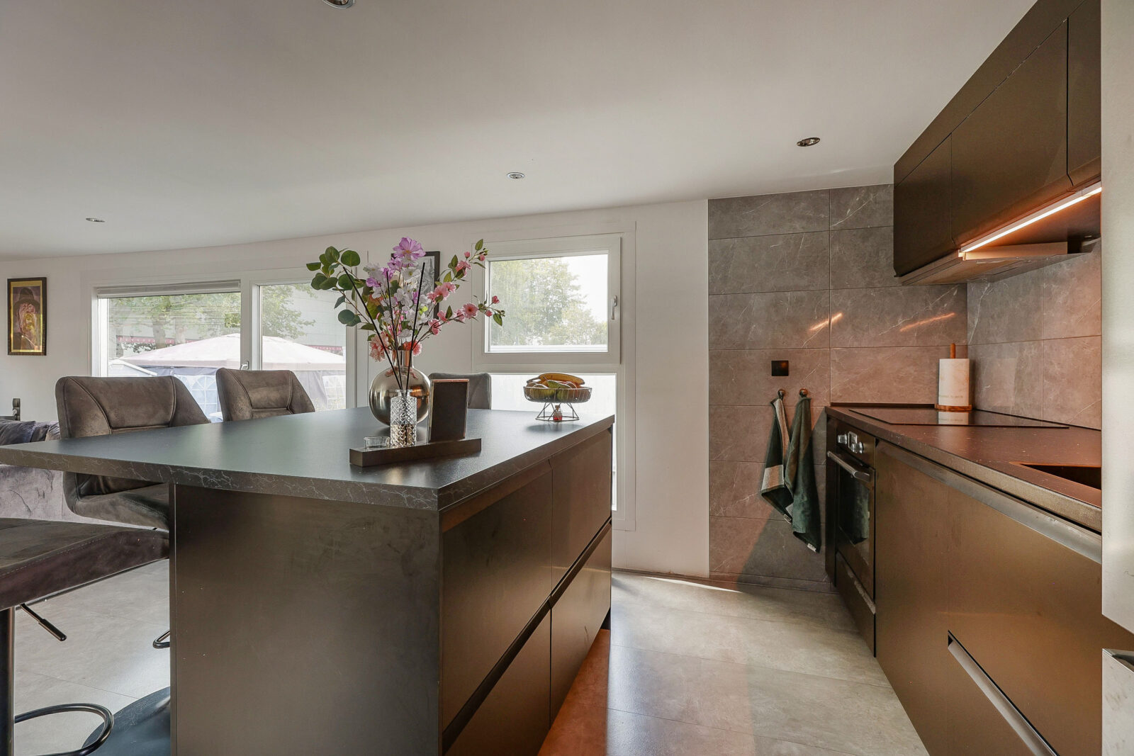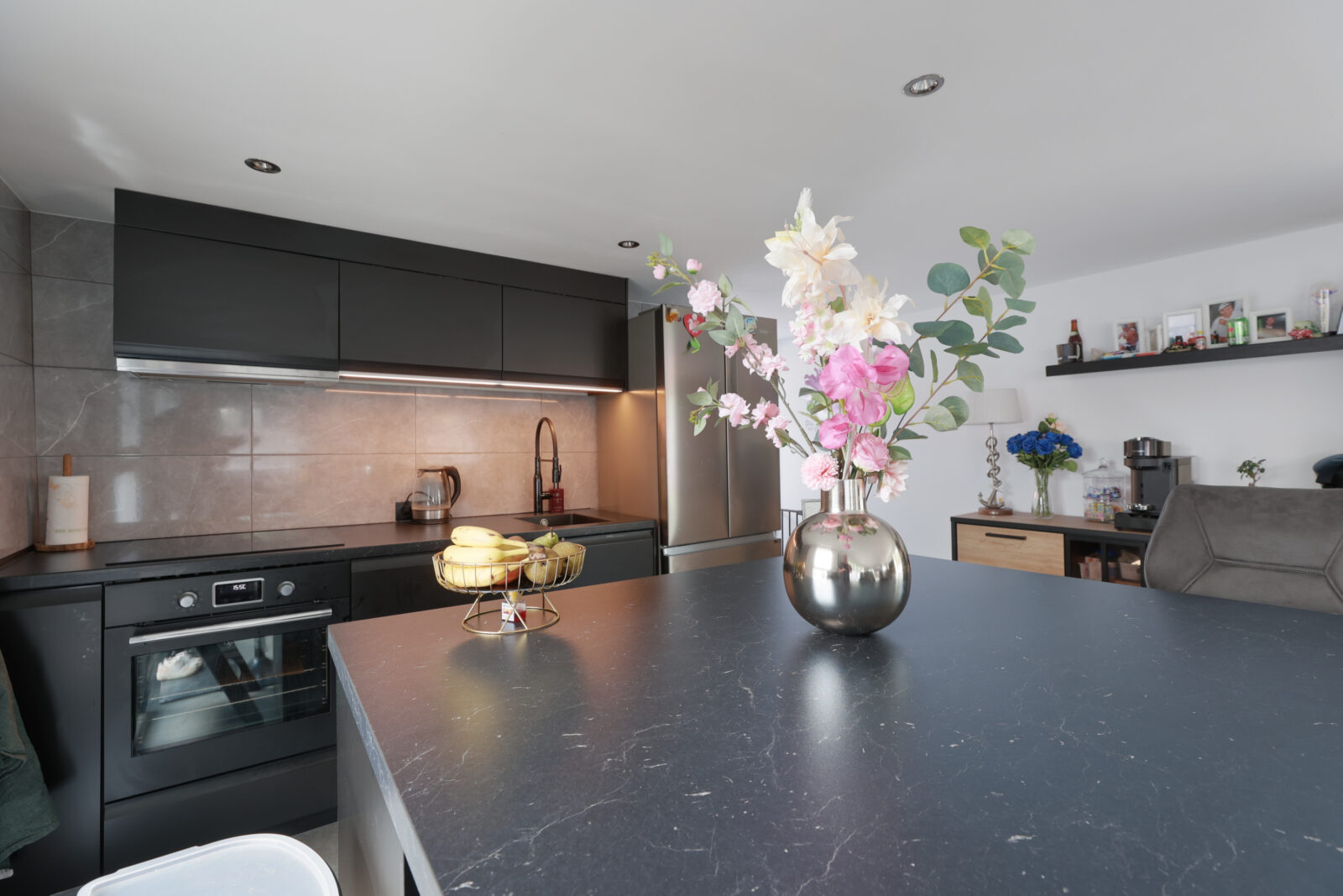 Binnenkomen doe je via de entree aan de walzijde. Vanuit de hal stap je direct de woonkamer in, een lichte, open ruimte met grote ramen, strak afgewerkte wanden en een moderne keuken met eiland. De keuken is afgewerkt met zwarte fronten en marmerlook achterwand en beschikt over een inductiekookplaat, vaatwasser, koelkast en oven. Alles is tot in detail verzorgd en helemaal van nu.