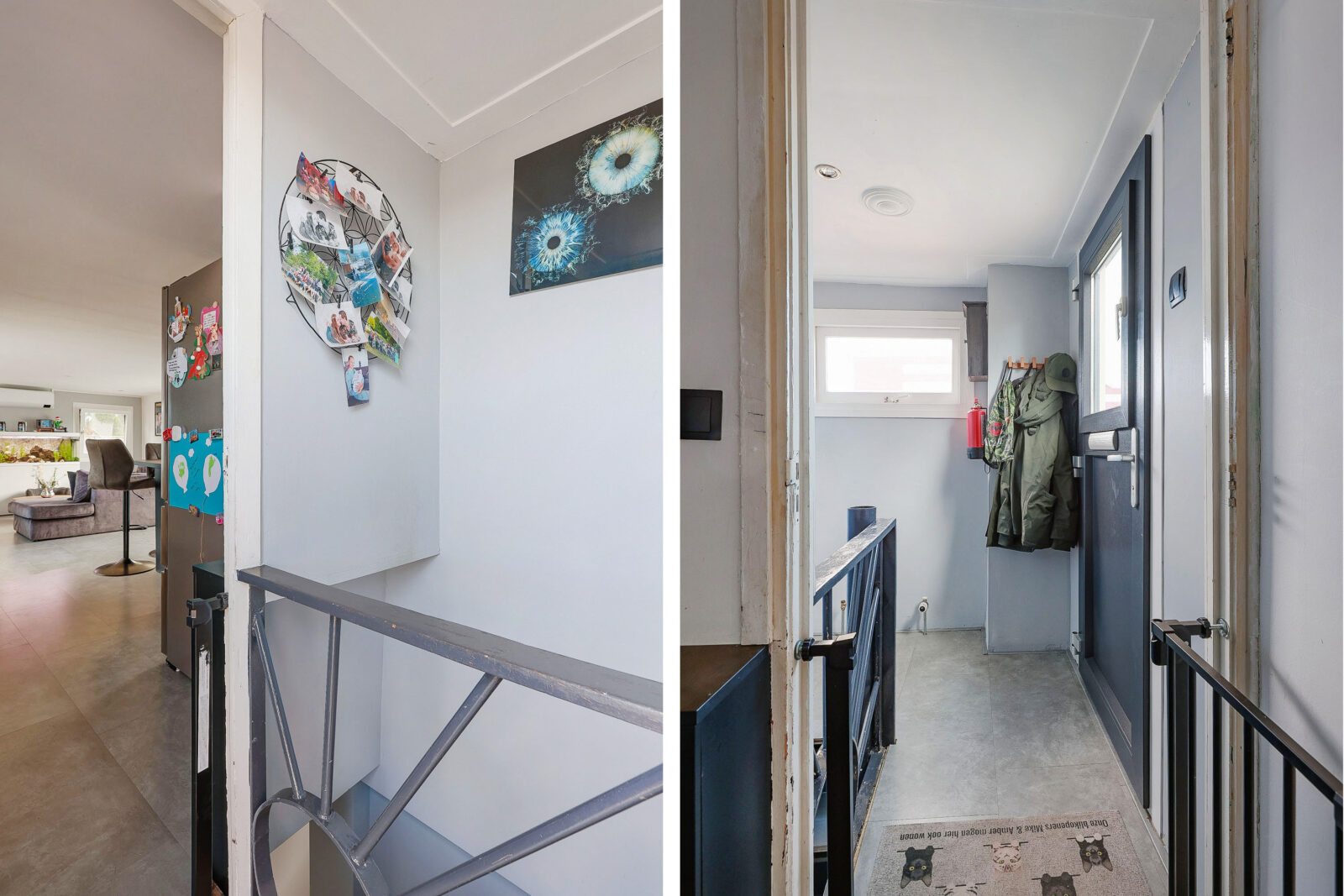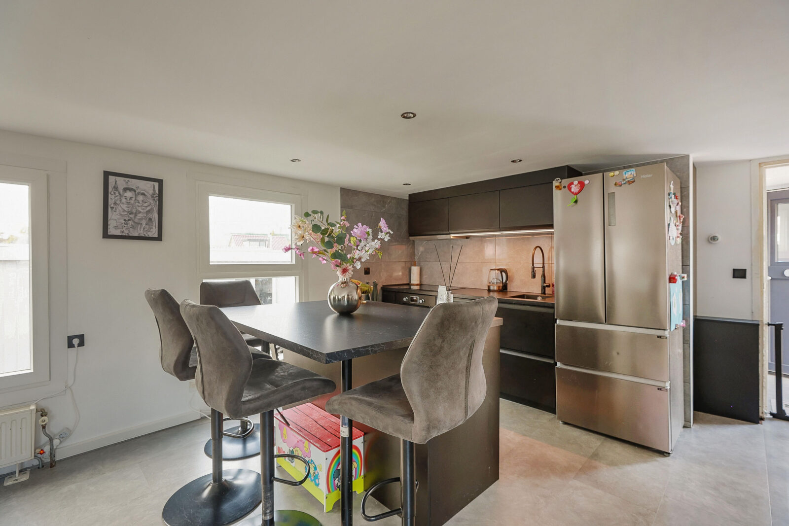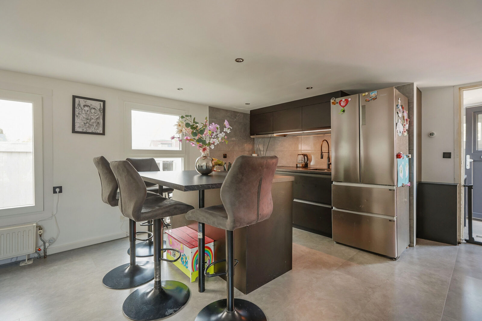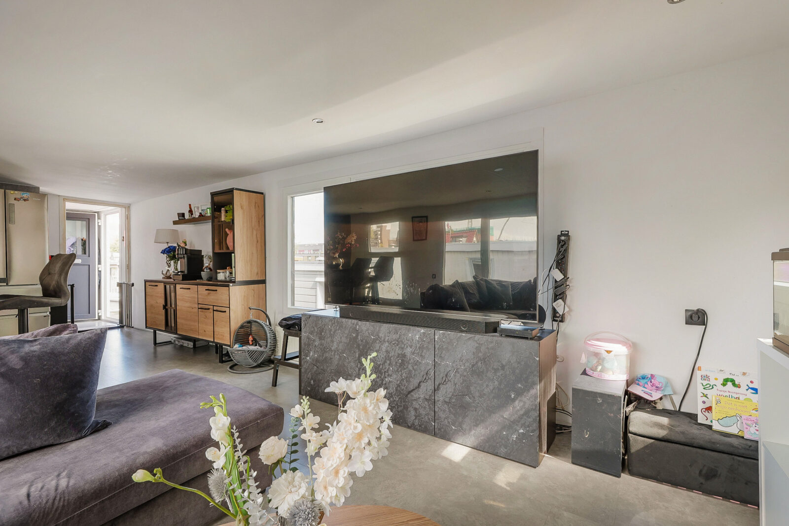 Binnenkomen doe je via de entree aan de walzijde. Vanuit de hal stap je direct de woonkamer in, een lichte, open ruimte met grote ramen, strak afgewerkte wanden en een moderne keuken met eiland. De keuken is afgewerkt met zwarte fronten en marmerlook achterwand en beschikt over een inductiekookplaat, vaatwasser, koelkast en oven. Alles is tot in detail verzorgd en helemaal van nu.