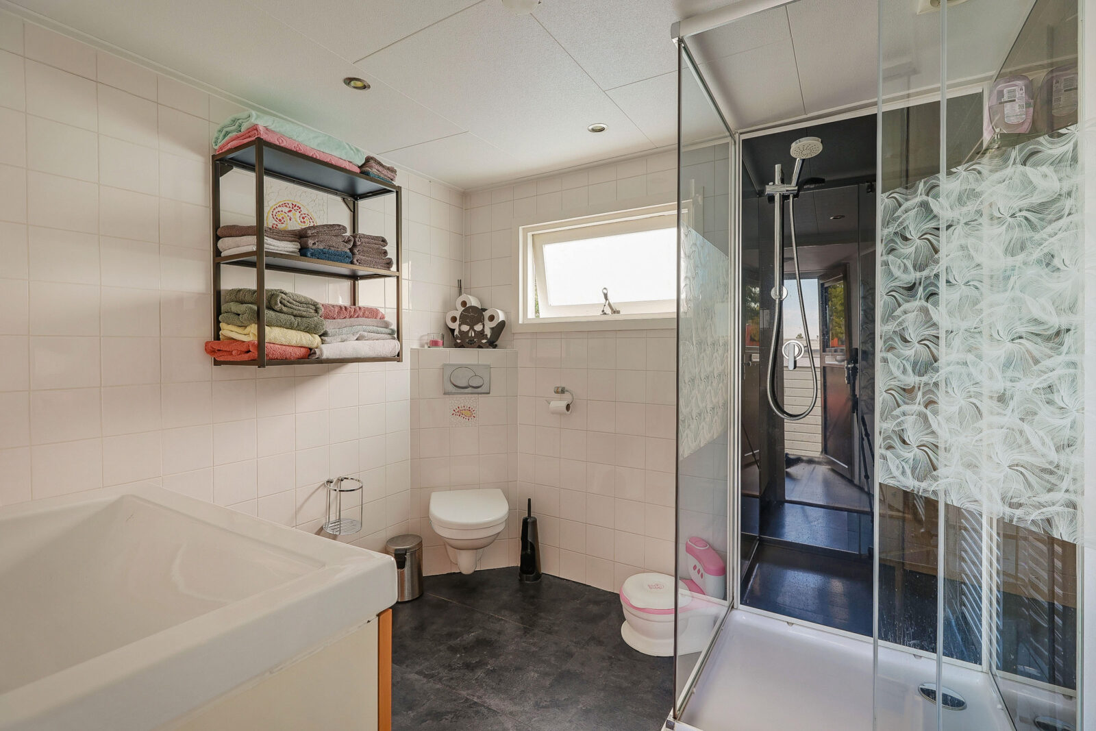 De badkamer is met een inloopdouche, toilet en wastafelmeubel. Een raam zorgt voor natuurlijk licht en ventilatie.