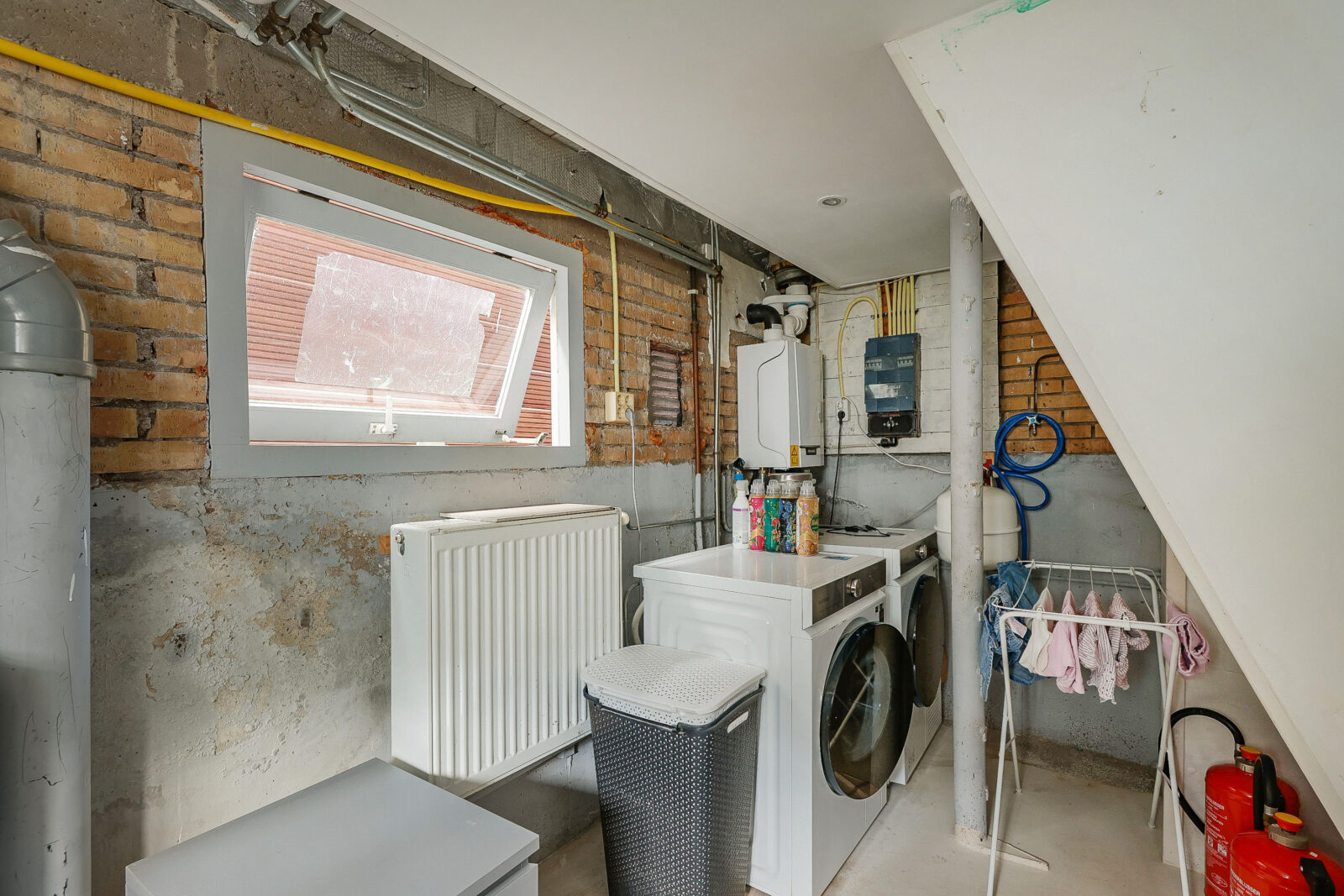 De benedenverdieping herbergt ook een praktische was-/bergruimte met aansluiting voor wasmachine en droger, de opstelling van de cv-ketel en rioolpomp. Deze ruimte is functioneel, maar kan nog worden afgewerkt of slim worden ingericht als extra opslag of hobbyruimte.