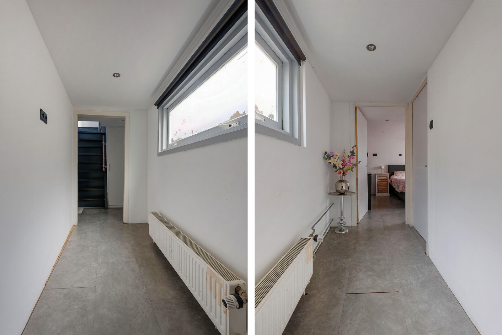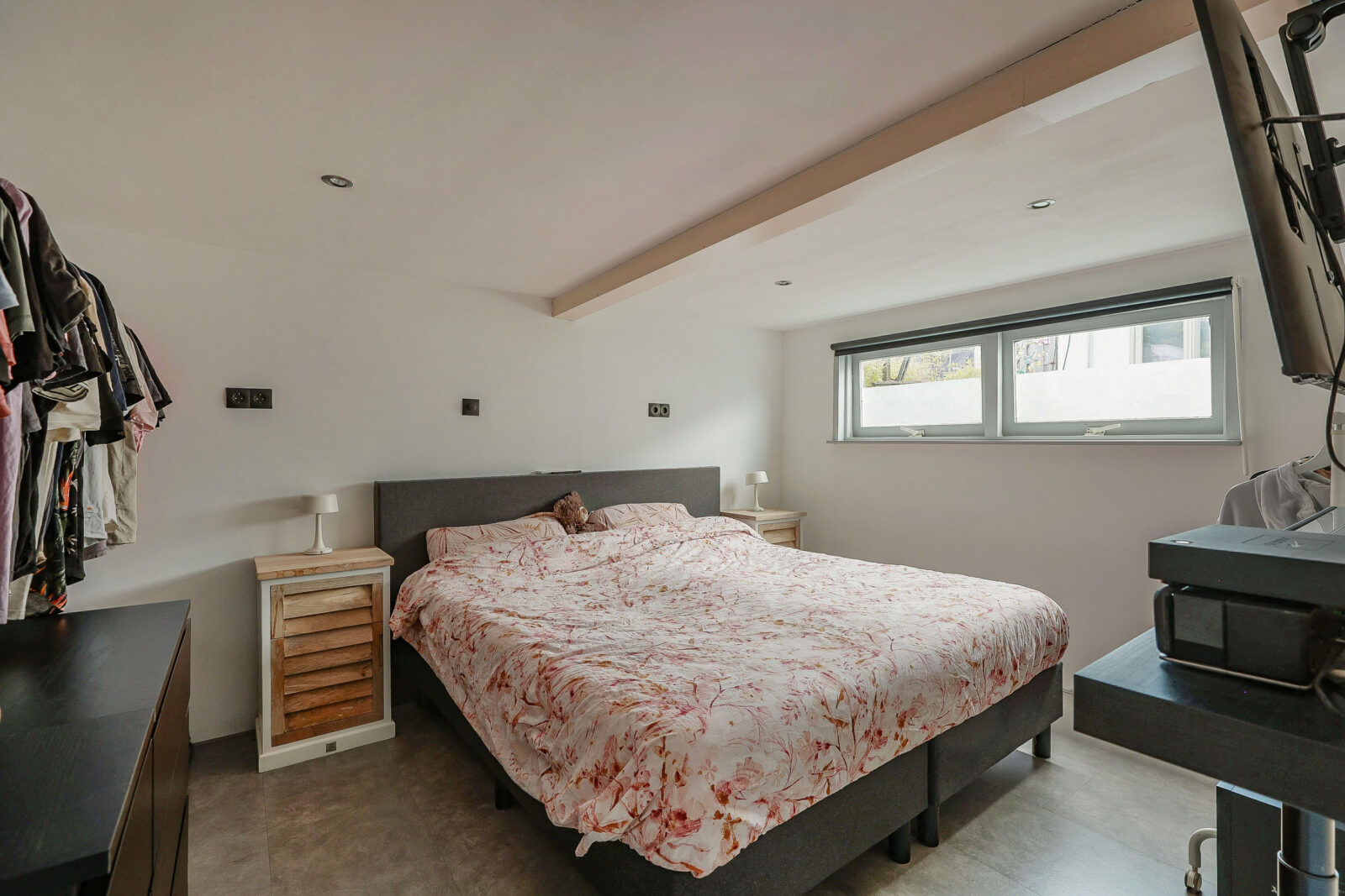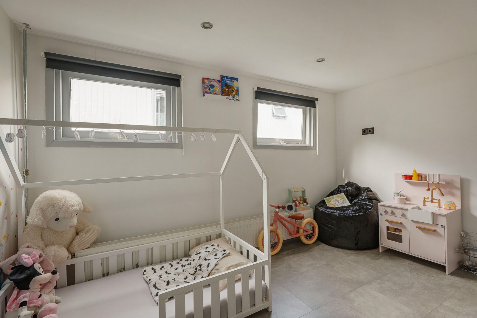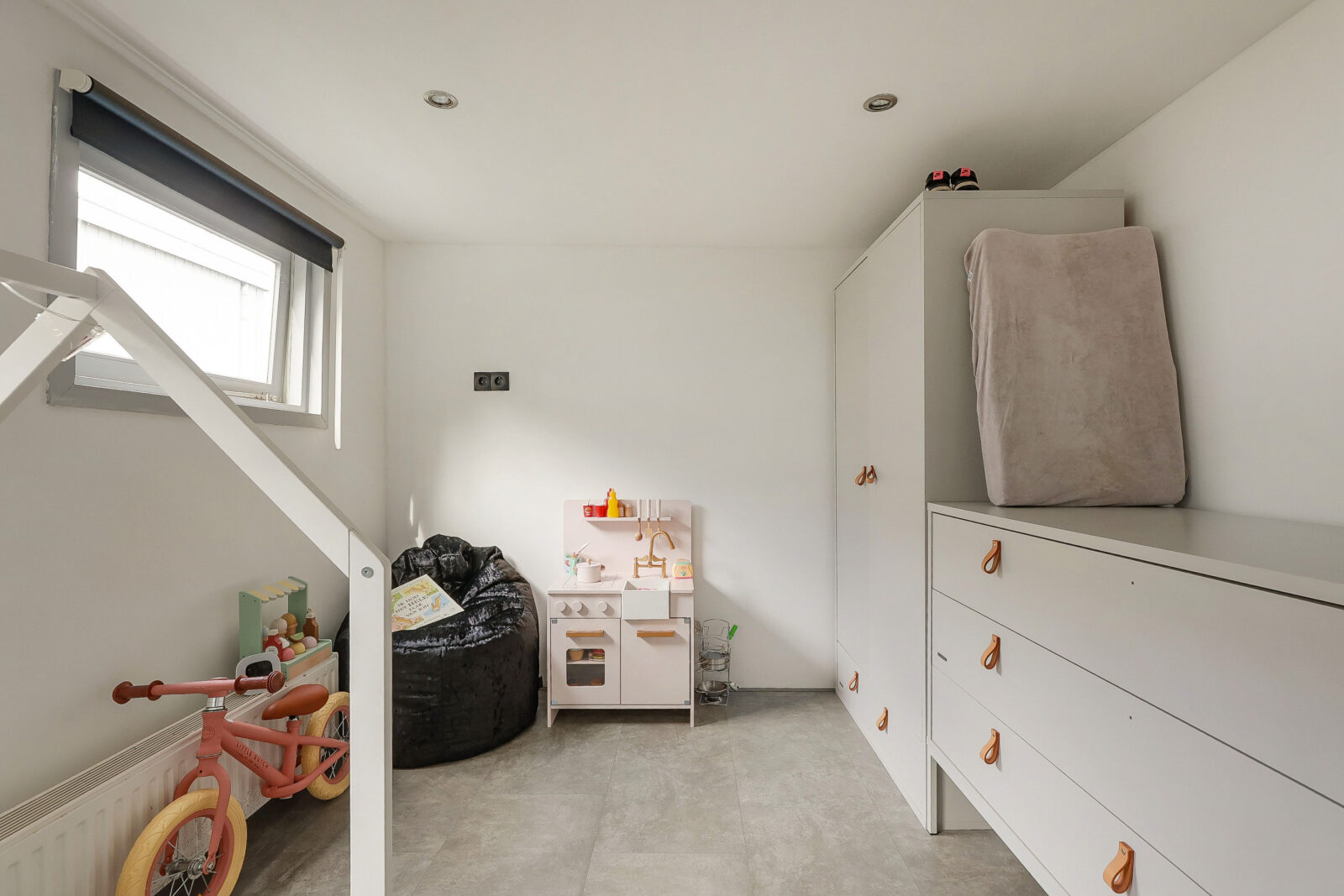 Een verdieping lager bevinden zich twee slaapkamers, bereikbaar via een lichte gang met lang horizontaal raam. De hoofdslaapkamer is royaal en sfeervol, de tweede kamer is momenteel ingericht als kinderkamer met speelhoek, maar kan net zo goed dienstdoen als werk- of logeerkamer.