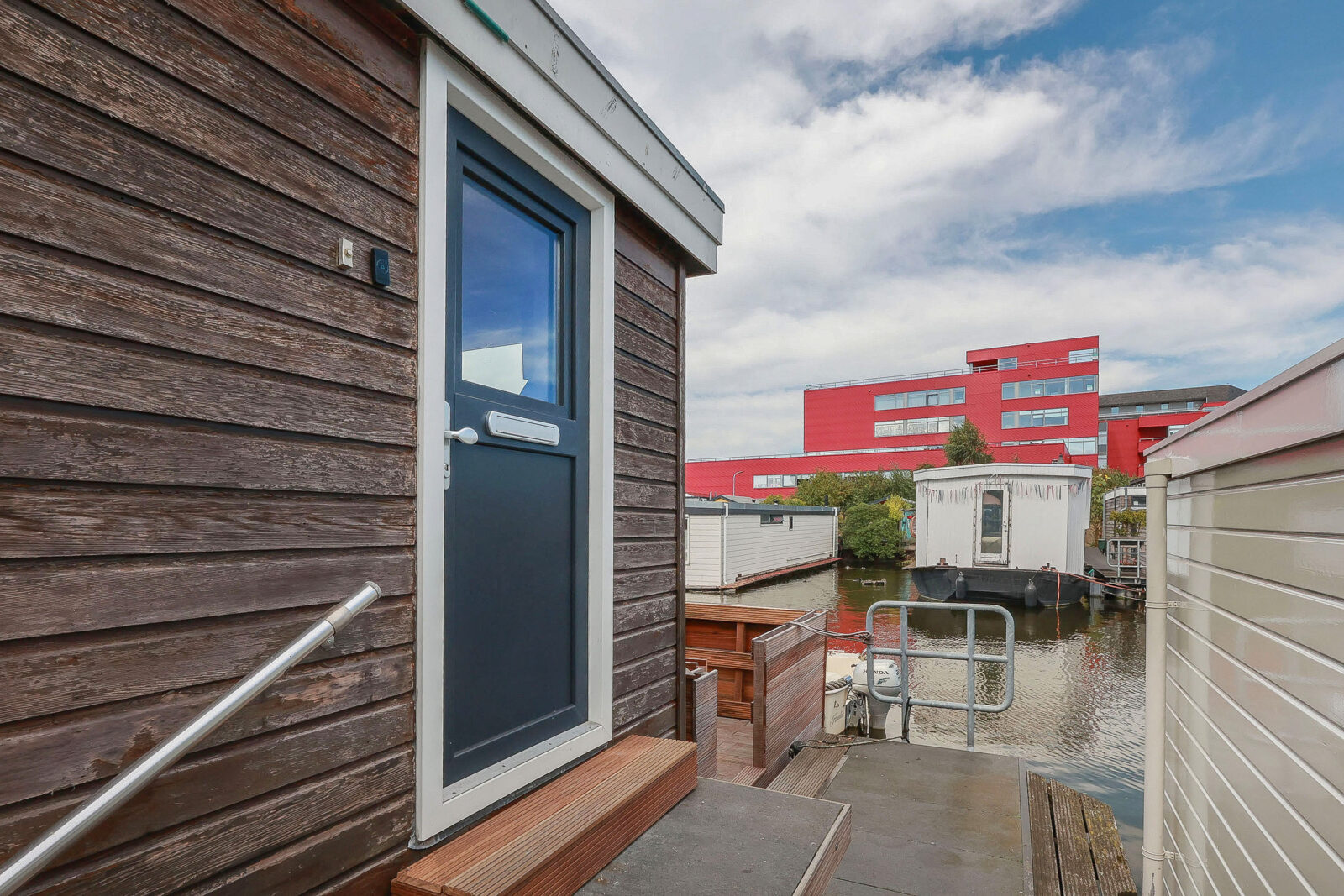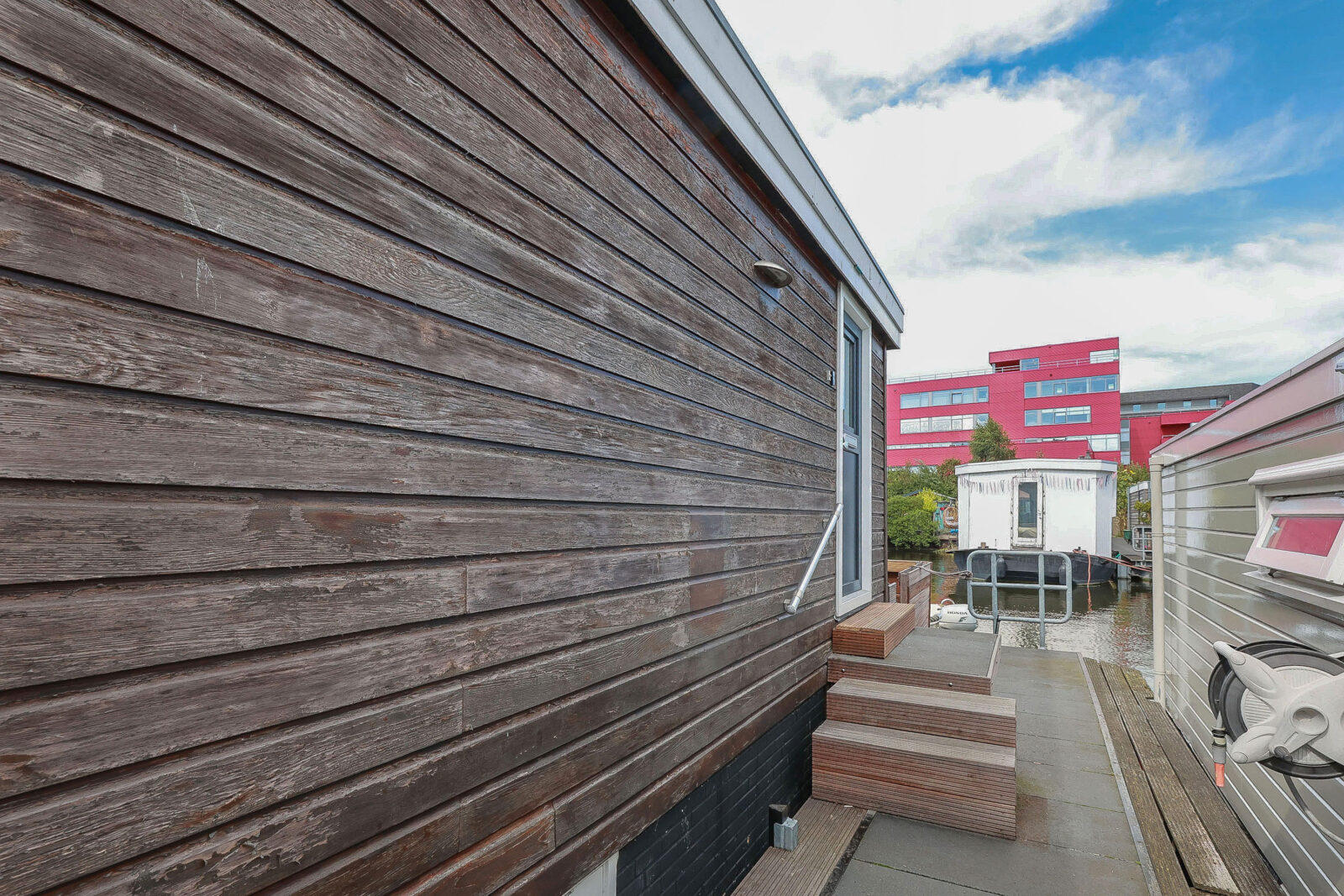 Aan de walzijde ligt een compacte tuin met vlonder, waar je beschut kunt zitten of kinderen kunt laten spelen. Aan de waterzijde biedt het drijvend terras een prachtige plek om buiten te leven – omringd door woonarken, bootjes en een verrassend rustige sfeer. Hier ervaar je hoe stads en ontspannen samen kunnen gaan.