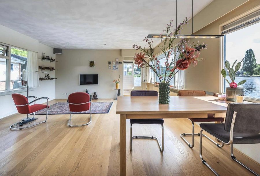 Met zijn courante maatvoering (17,30 x 5,15 m) en grote raampartijen biedt deze ark een heerlijk lichte en open woonbeleving. Vanuit de woonkamer kijk je weids uit over het water. De houten vloer en slimme indeling zorgen voor een warme, prettige sfeer.