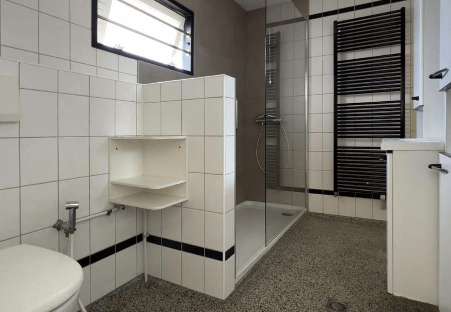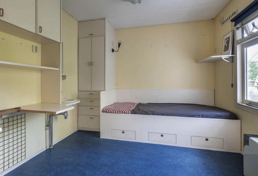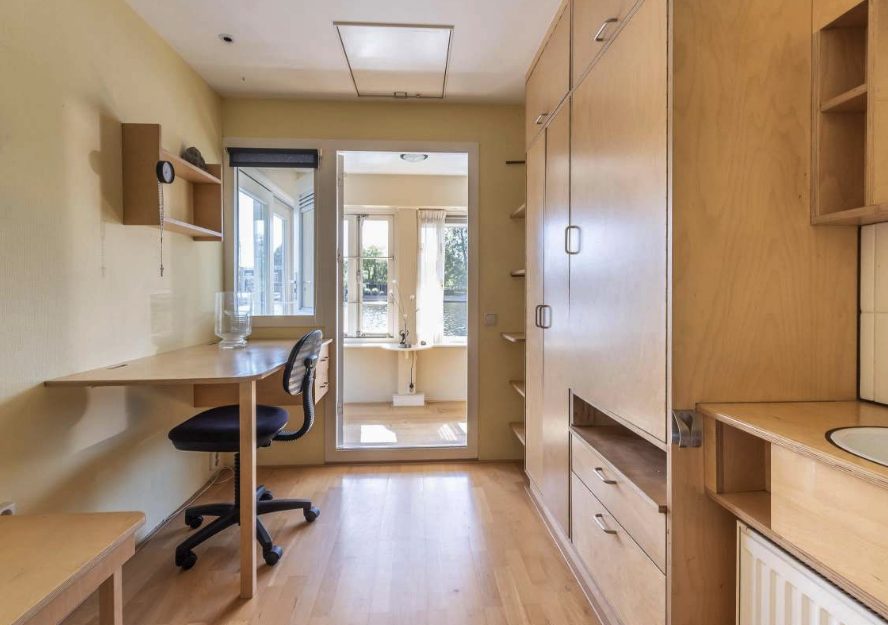 Achter de keuken vind je de badkamer, met douche, wastafelmeubel en tweede toilet. De ouderslaapkamer ligt aan de waterzijde en heeft een vaste kast. Daarnaast zijn er twee extra kamers: één met vaste wastafel en een tweede met zicht op de tuin. De vierde kamer is compact en perfect als werkkamer of kinderkamer.