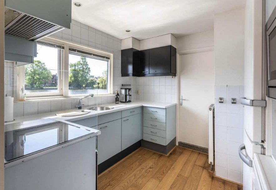 De entree is ruim en praktisch, met vaste kasten en een separaat toilet. De woonkamer is ruim te noemen, met extra slaapkamer in de (korte) overbouw – ideaal als logeerkamer, leeshoek of atelier. De keuken – voorzien van inbouwapparatuur en opstelling cv-installatie (2012) – ligt centraal in de ark.