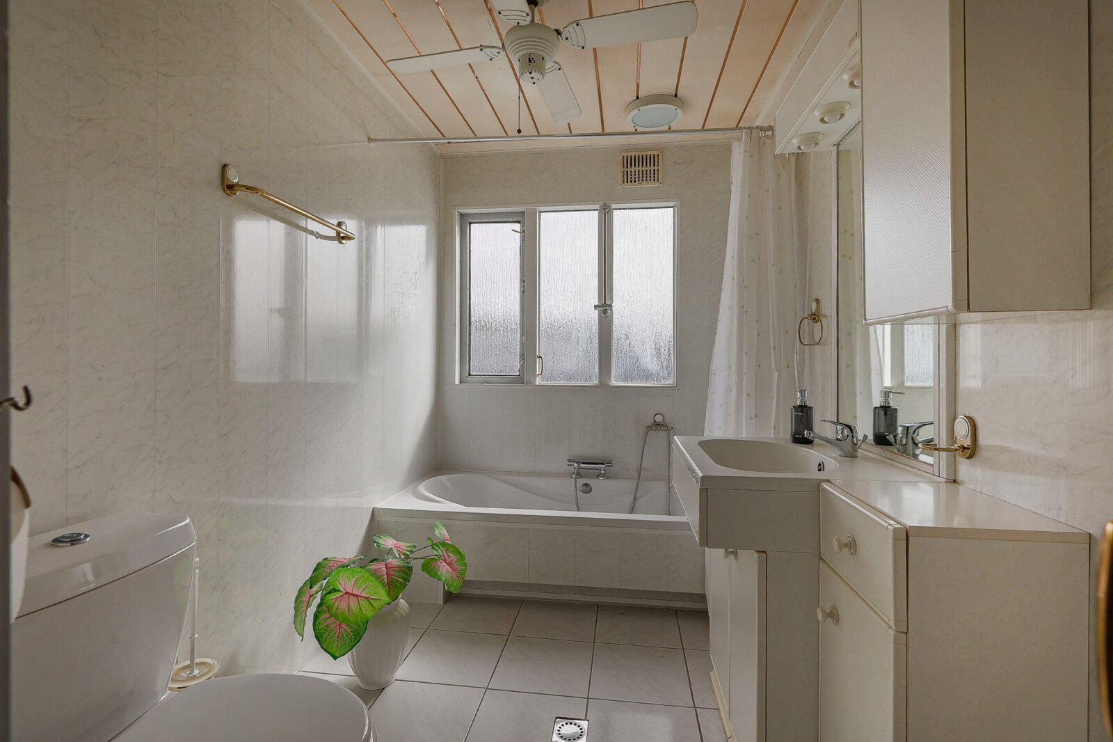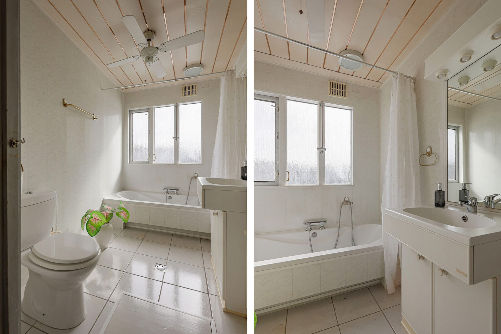 De badkamer is royaal opgezet en voorzien van ligbad, toilet en wastafelmeubel. Dankzij het aanwezige raam is ook hier prettig daglicht aanwezig.