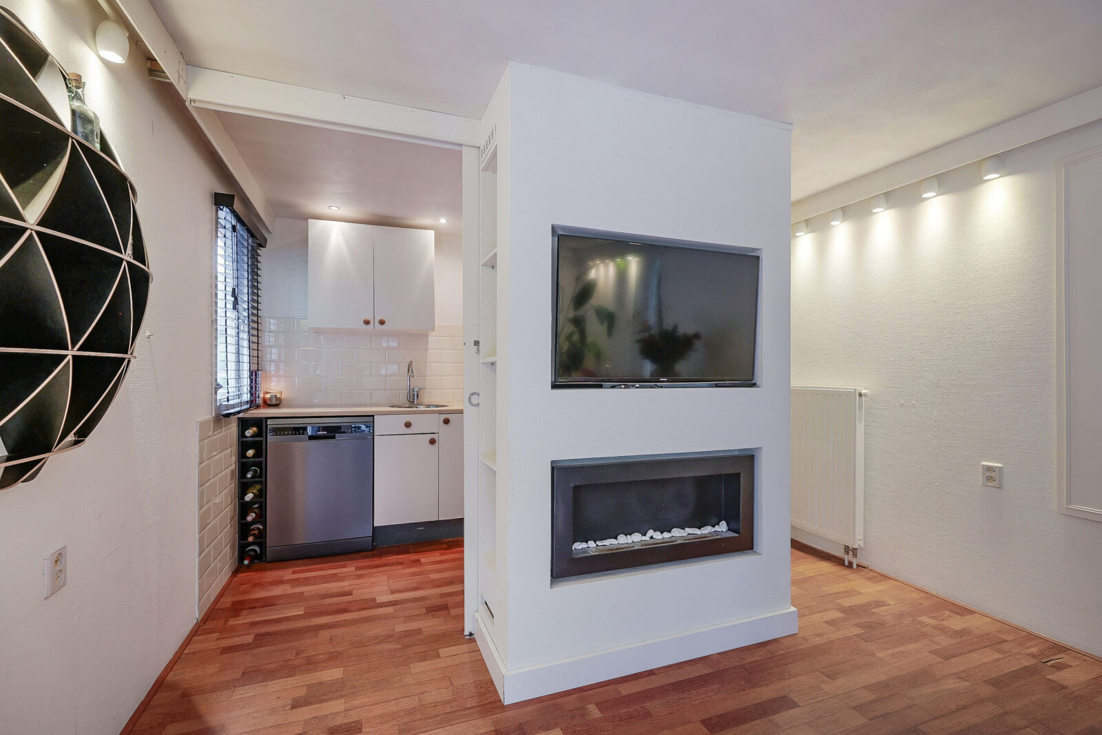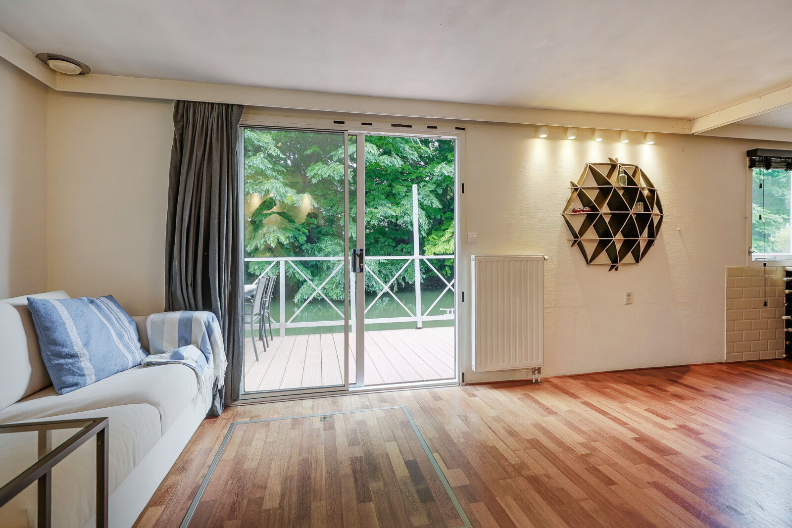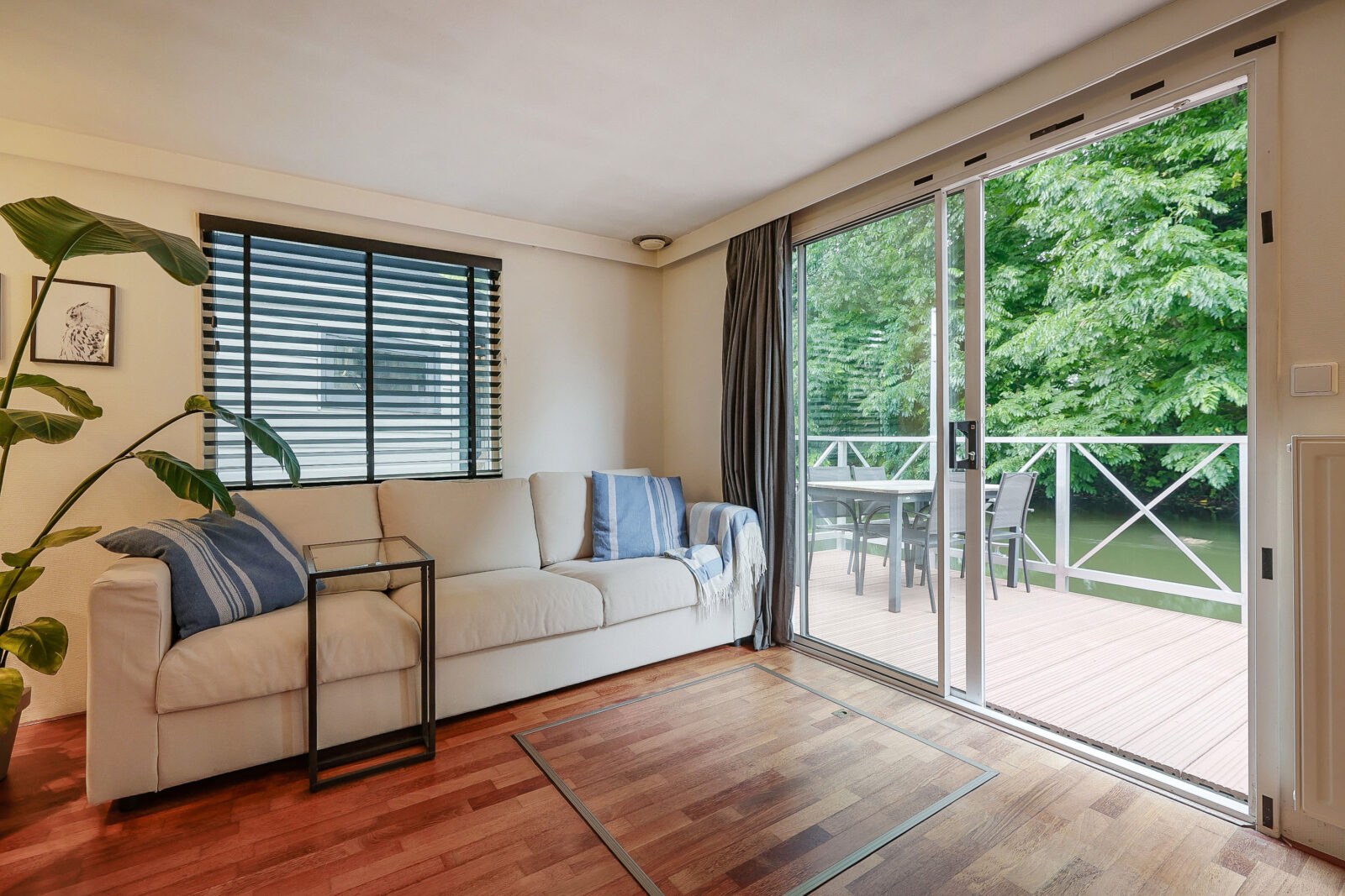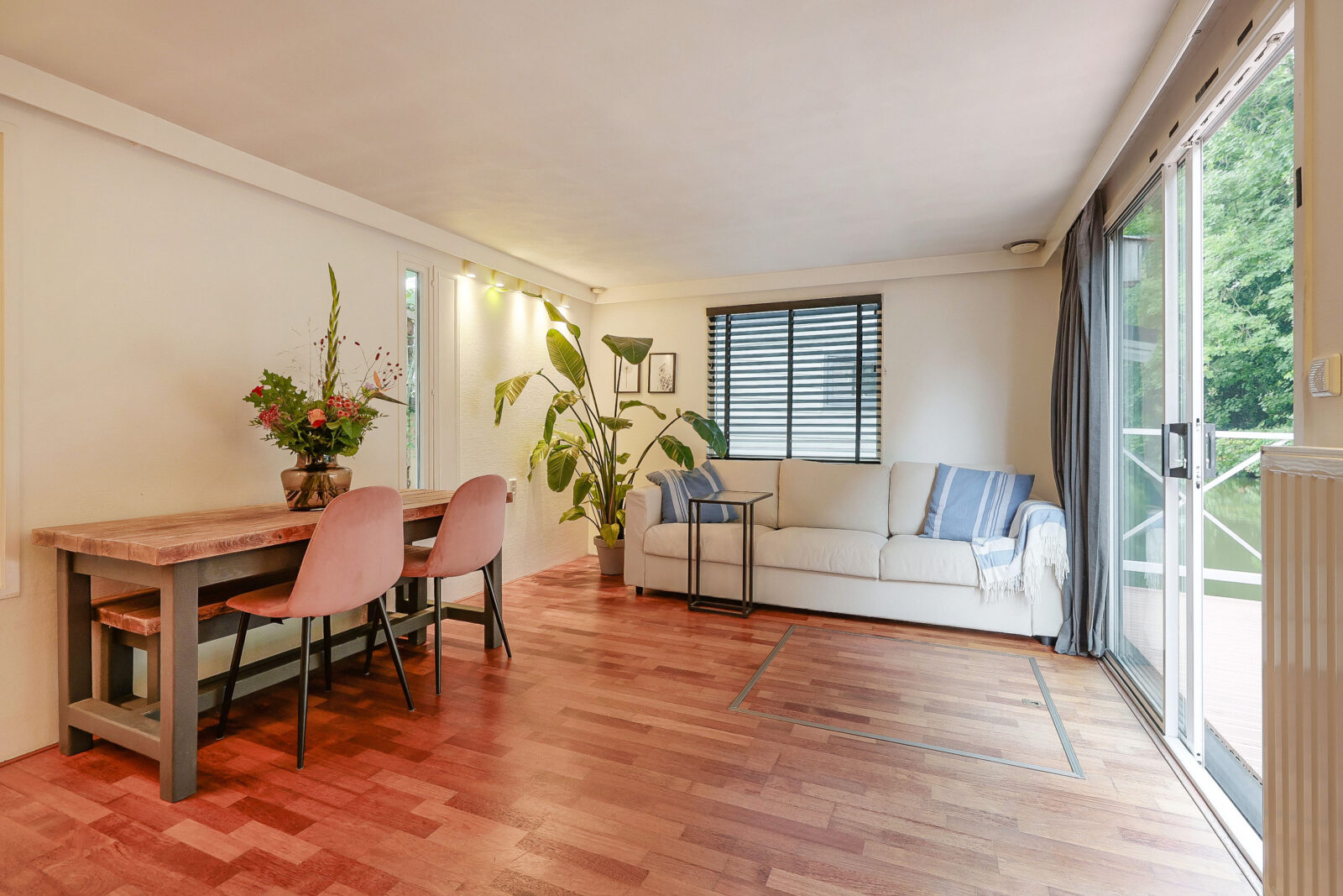 De woonark is efficiënt ingedeeld en voelt licht en ruim. Vanuit de entree aan de walzijde bereik je de hal met toegang tot alle vertrekken. De woonkamer heeft een warme uitstraling, mede dankzij de houten vloer, bio-ethanol haard en grote schuifpui naar het terras. De halfopen keuken is compact maar compleet, met fornuis, koelkast en vaatwasser.