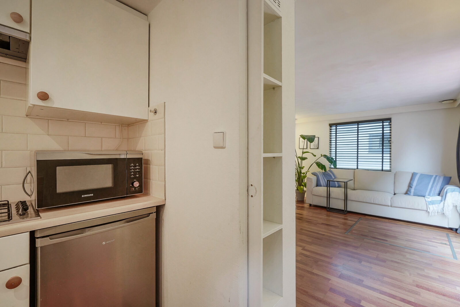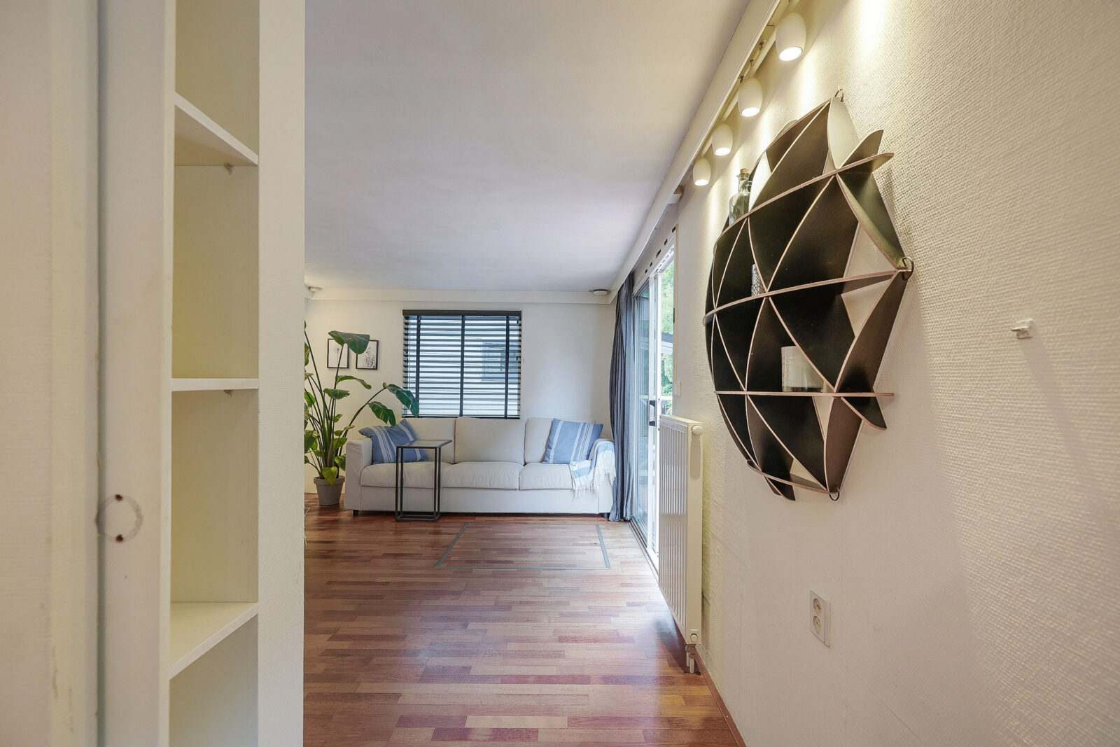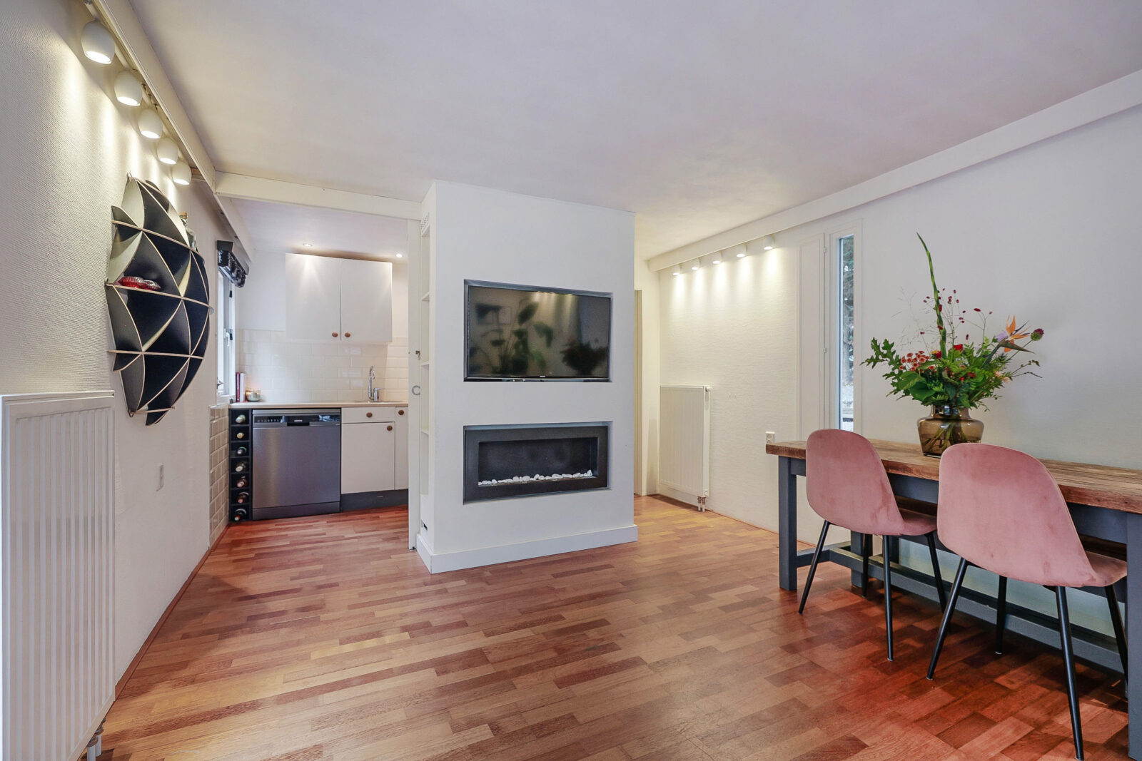 De woonark is efficiënt ingedeeld en voelt licht en ruim. Vanuit de entree aan de walzijde bereik je de hal met toegang tot alle vertrekken. De woonkamer heeft een warme uitstraling, mede dankzij de houten vloer, bio-ethanol haard en grote schuifpui naar het terras. De halfopen keuken is compact maar compleet, met fornuis, koelkast en vaatwasser.