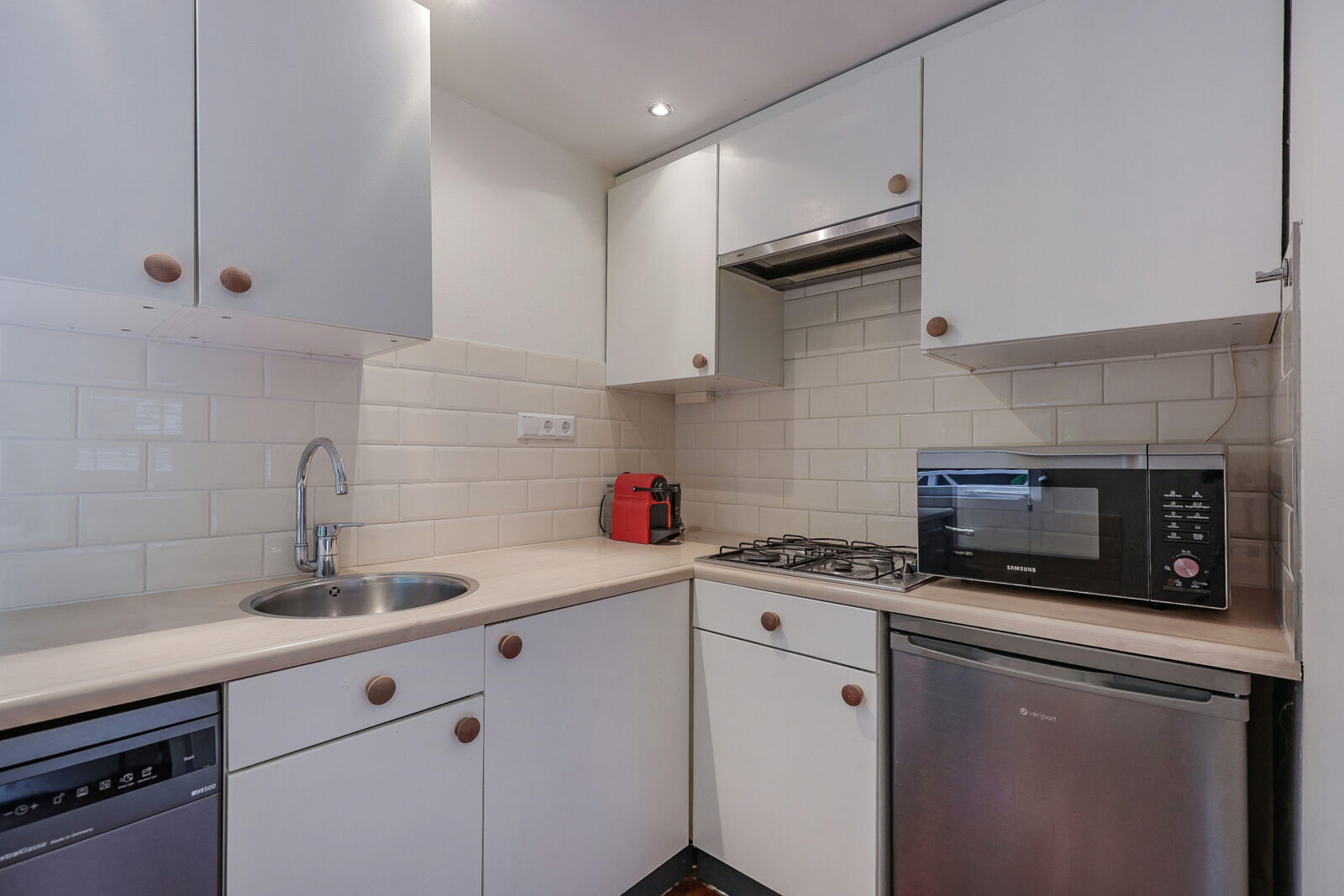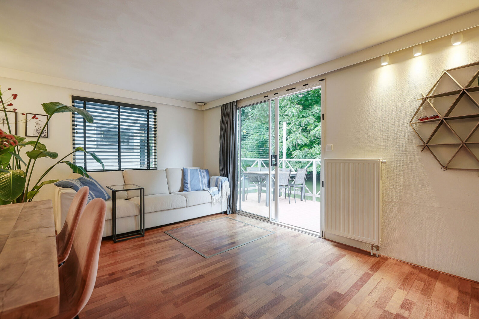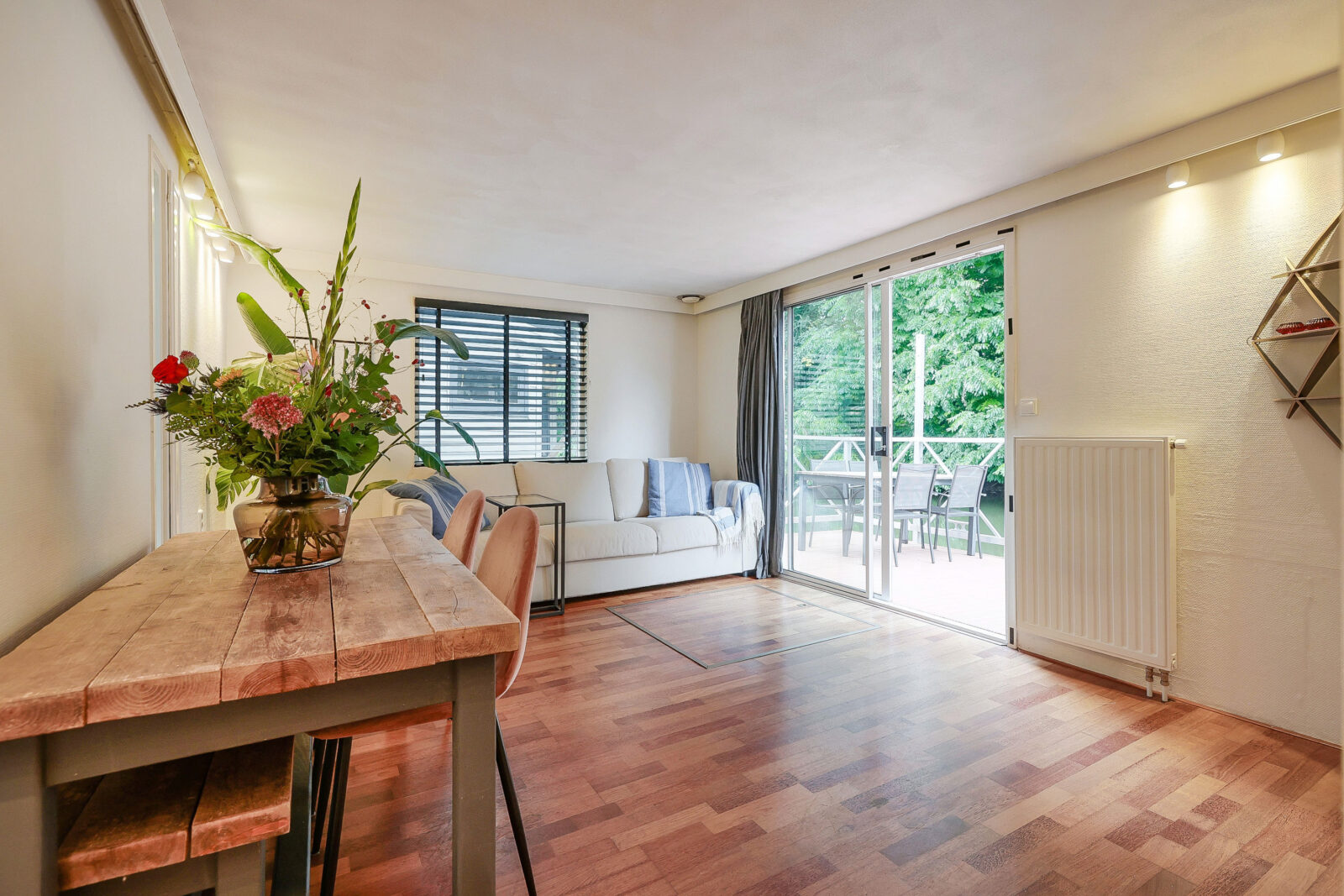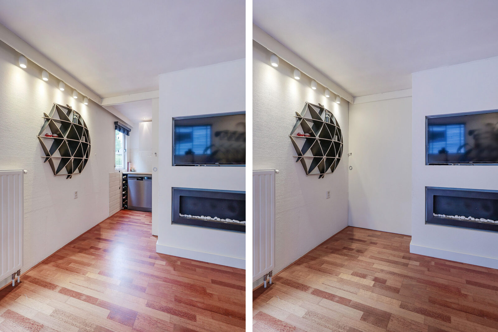 De woonark is efficiënt ingedeeld en voelt licht en ruim. Vanuit de entree aan de walzijde bereik je de hal met toegang tot alle vertrekken. De woonkamer heeft een warme uitstraling, mede dankzij de houten vloer, bio-ethanol haard en grote schuifpui naar het terras. De halfopen keuken is compact maar compleet, met fornuis, koelkast en vaatwasser.