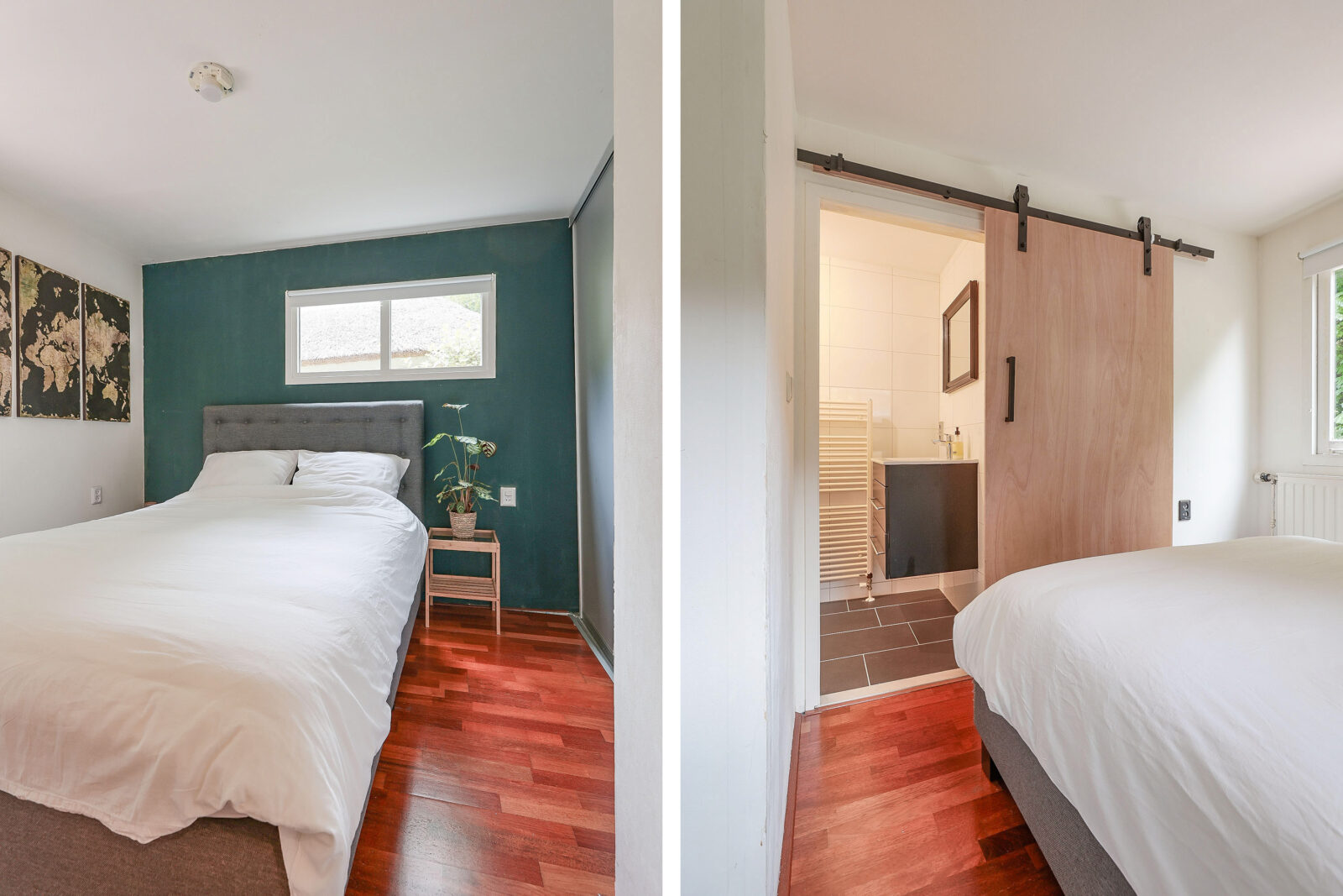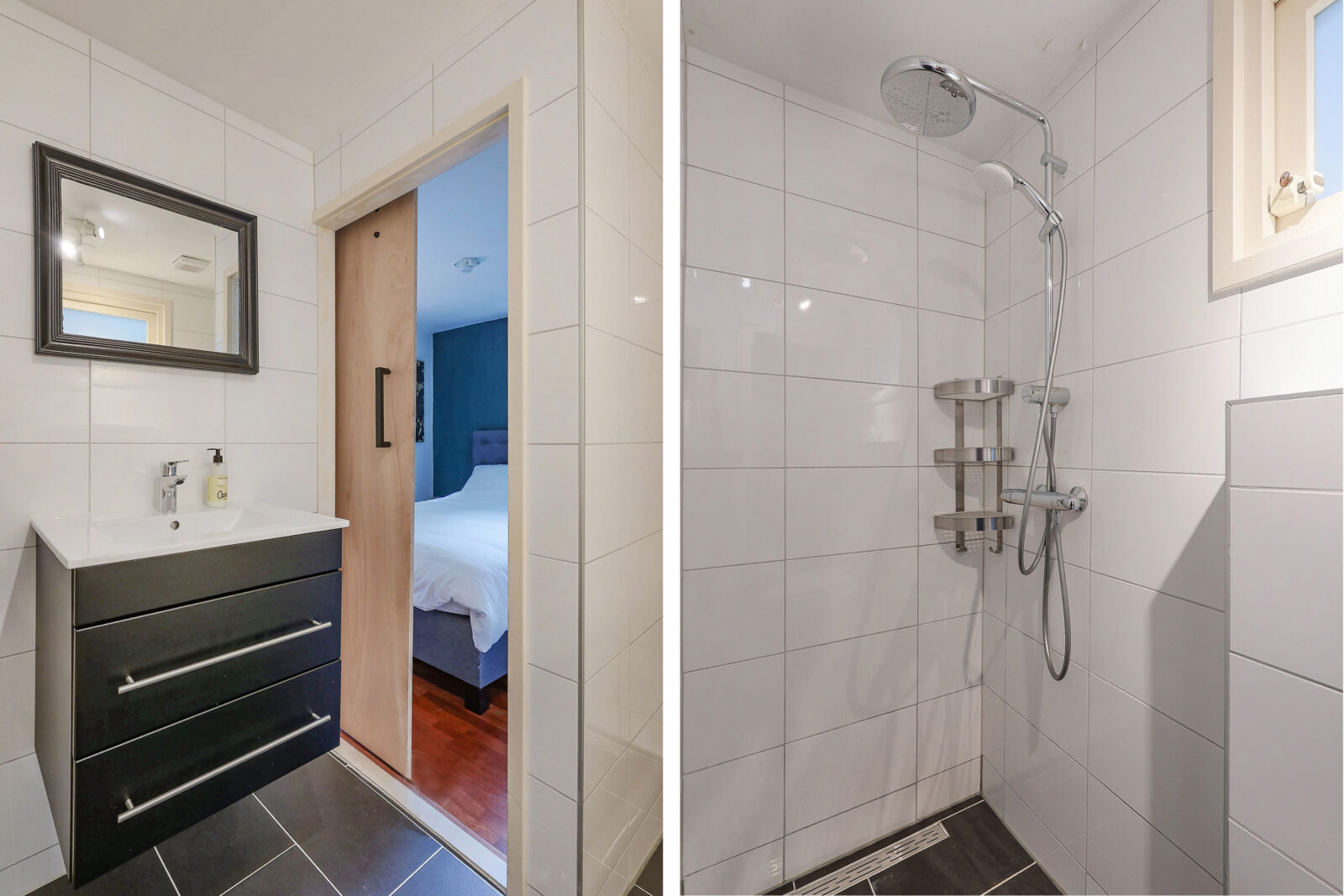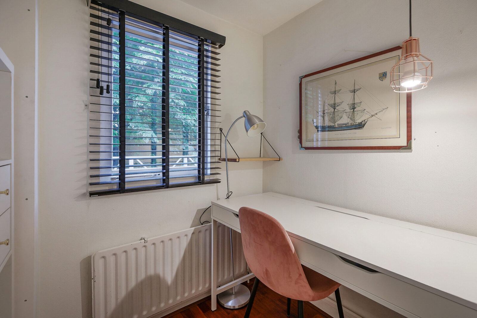 Er zijn twee slaapkamers, waarvan één uitstekend geschikt is als werk- of logeerkamer. De ouderslaapkamer beschikt over een vaste kast. De badkamer is voorzien van douche, toilet en wastafelmeubel. In het casco bevindt zich een praktische berging met aansluiting voor de wasmachine.