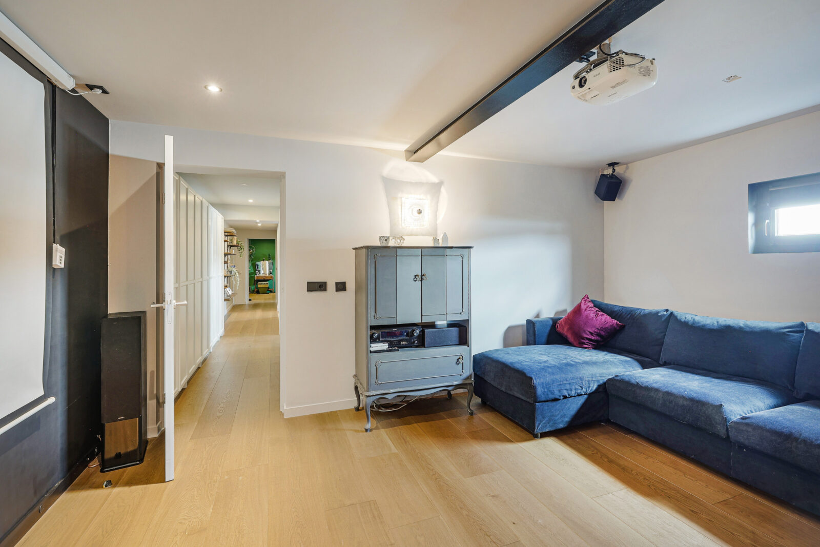 Op de slaapverdieping draait alles om comfort. De badkamer in oosterse stijl is uitgerust met dubbele waskommen, een ligbad, inloopdouche én een royale Finse sauna. Er is een apart toilet, een ruimte voor de wasmachine en droger, en twee slaapkamers aan weerszijden van de hal met vaste kastruimte. Eén kamer beschikt over een grote inloopkast, de andere doet nu dienst als thuisbioscoop.